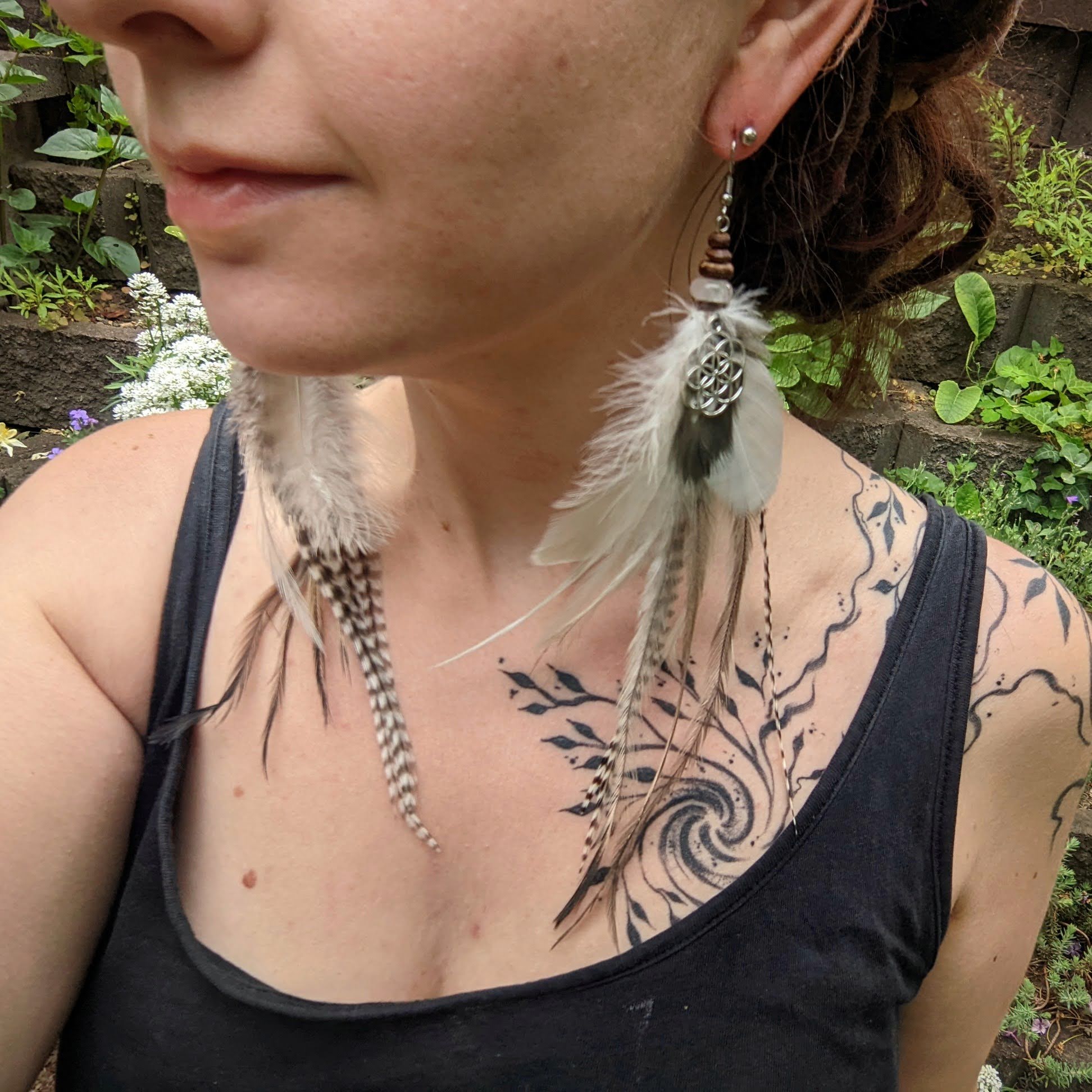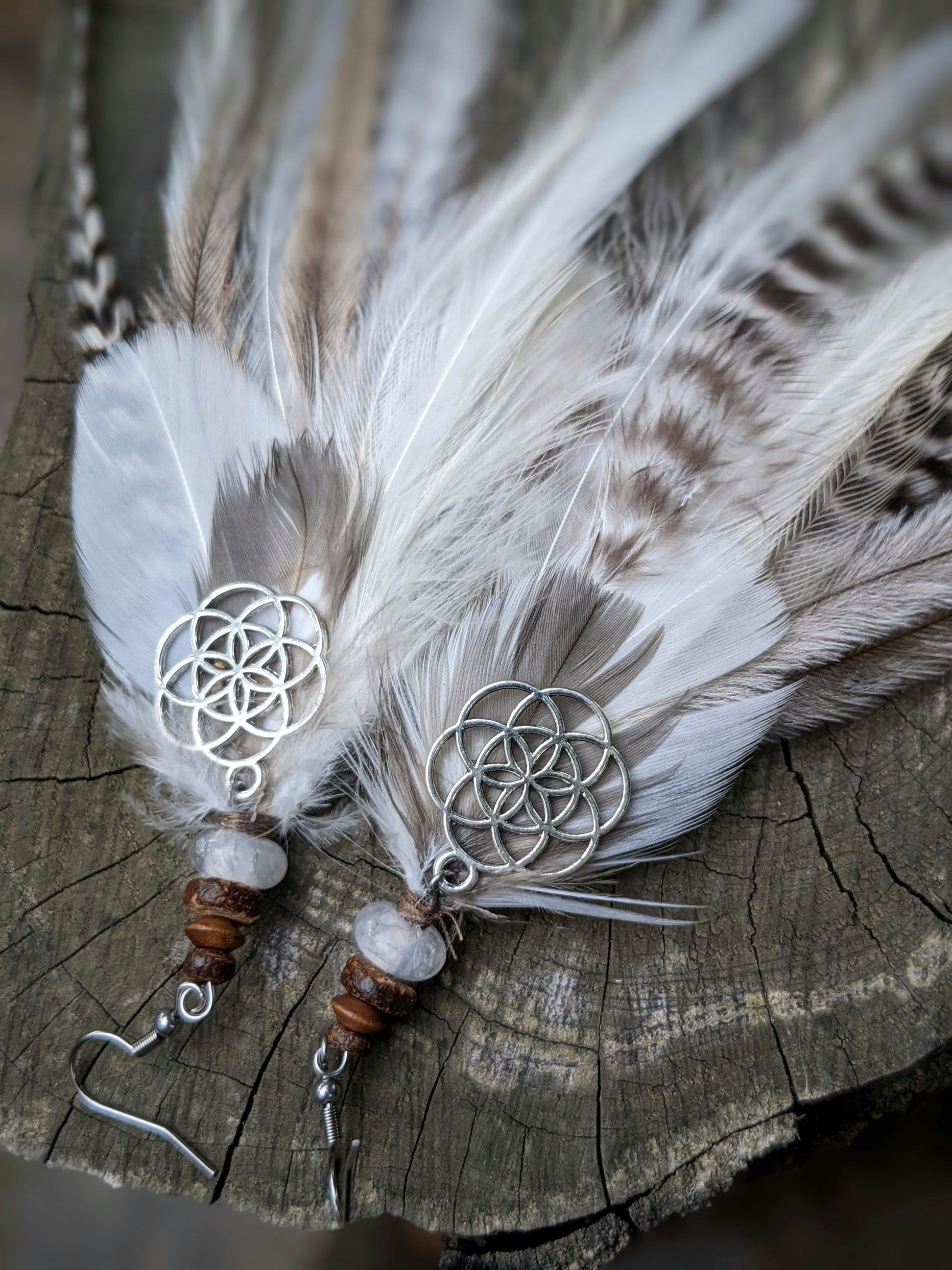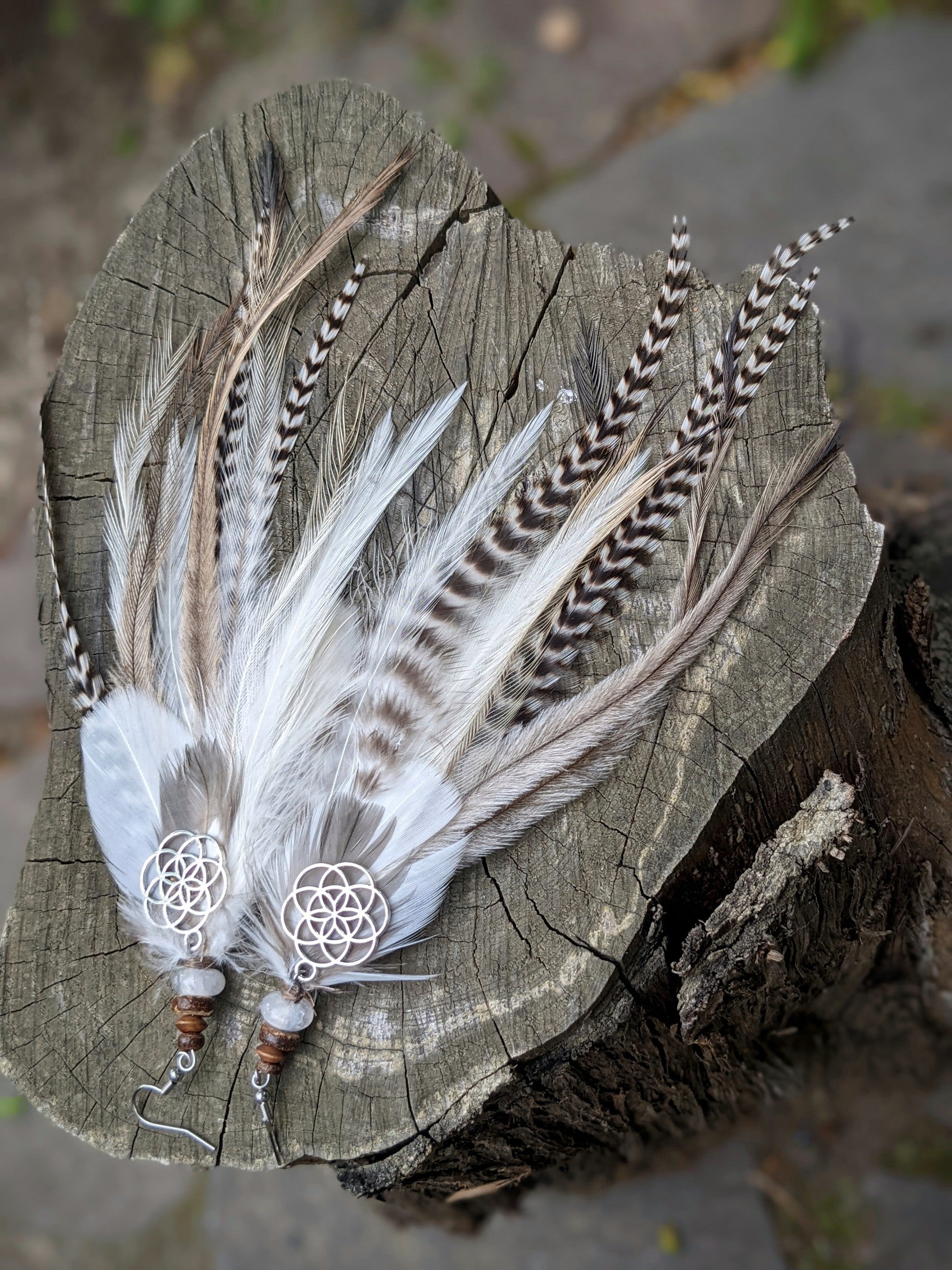 Distinctive feather earrings (swan, buzzard, rooster, emu...) with mandala complemented by crystal beads, wooden and metal beads. Hooks are made of surgical steel, supplied with silicone stoppers. The length of the decorative part of the earrings is up to 20 cm.