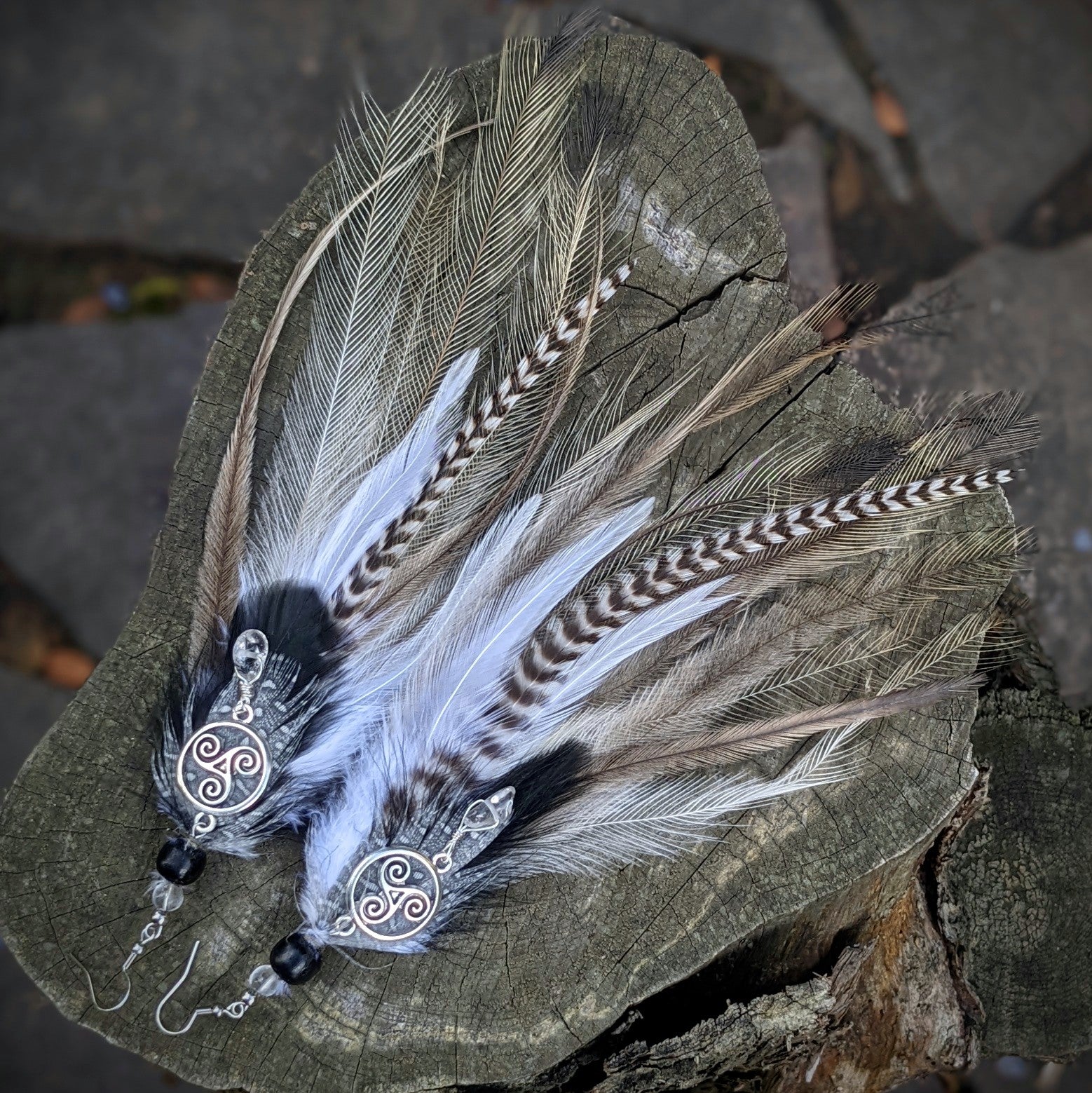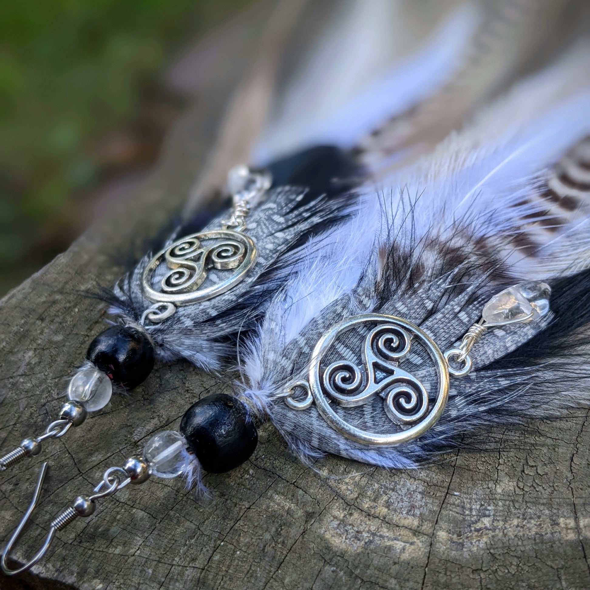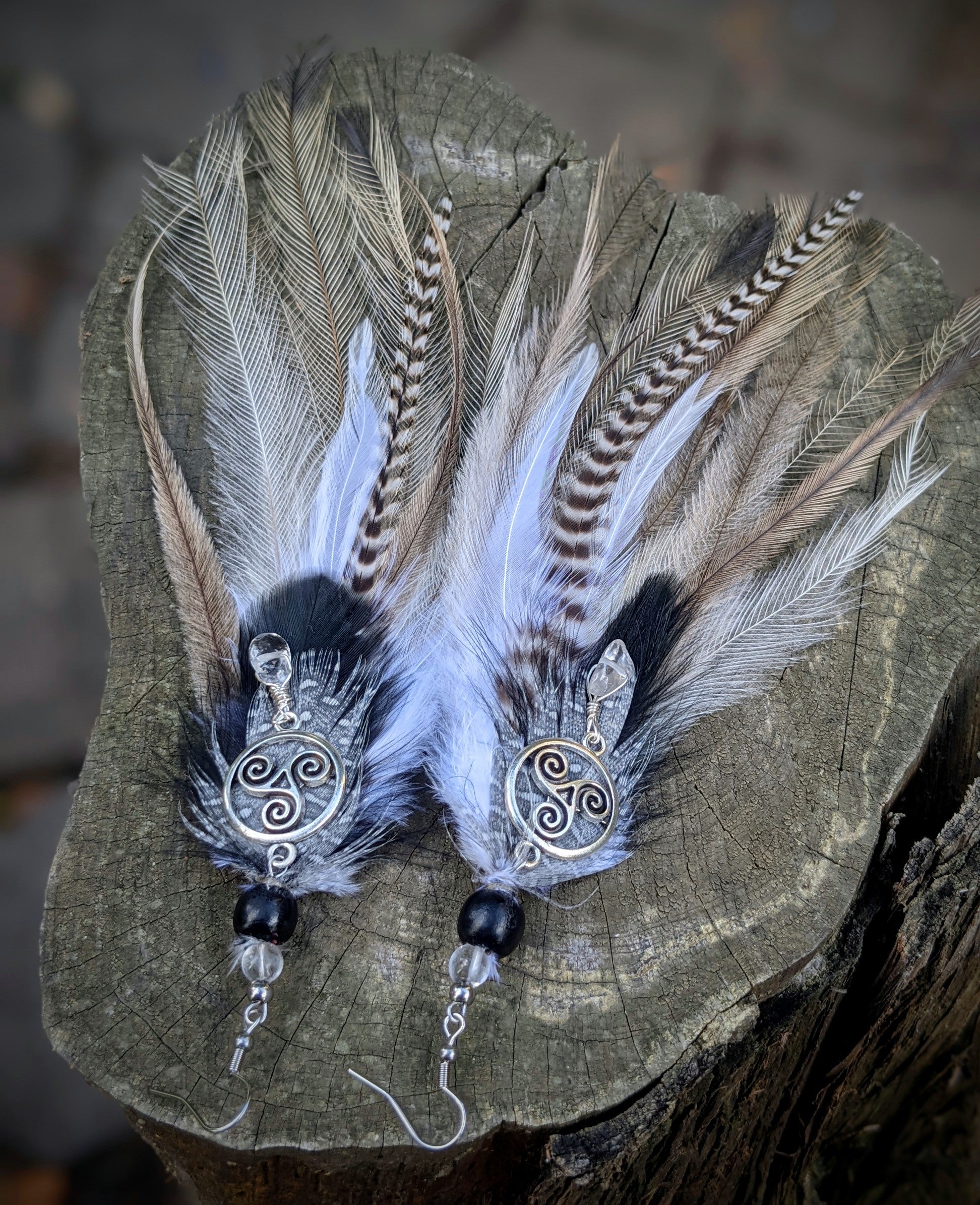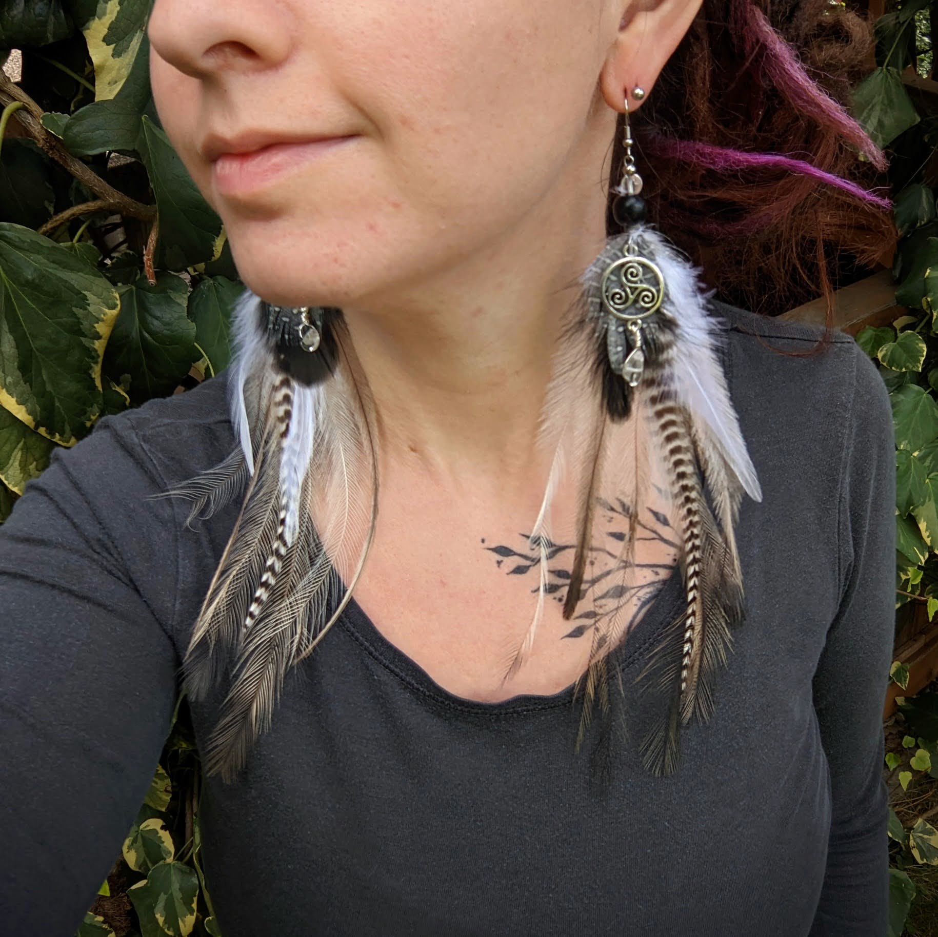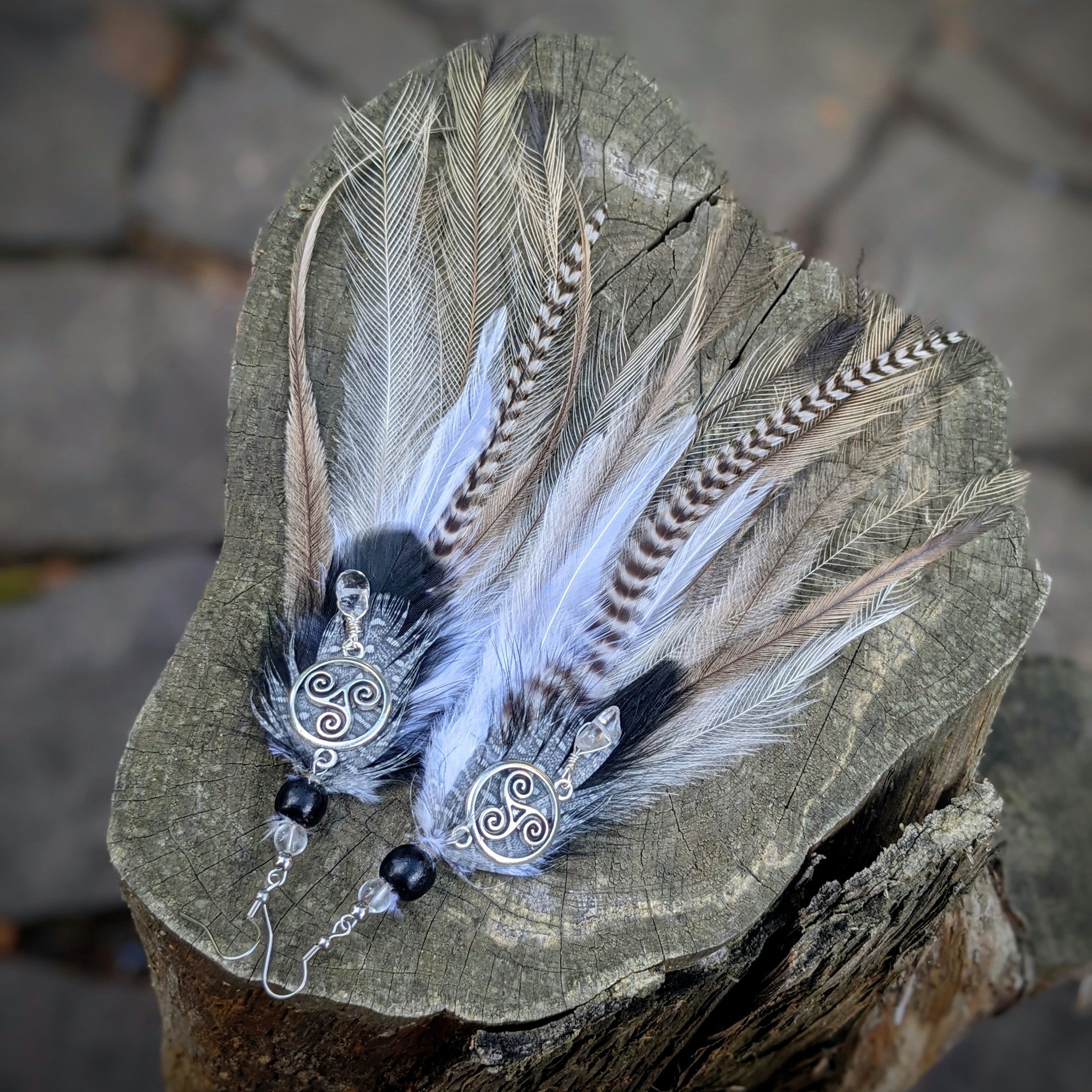Distinctive long feather earrings (emu, pearl, rooster...) complemented by wood and crystal beads and a triskelion symbol. The hooks are made of surgical steel, and come with silicone stoppers. The length of the decorative part of the earrings is approximately 24 cm.