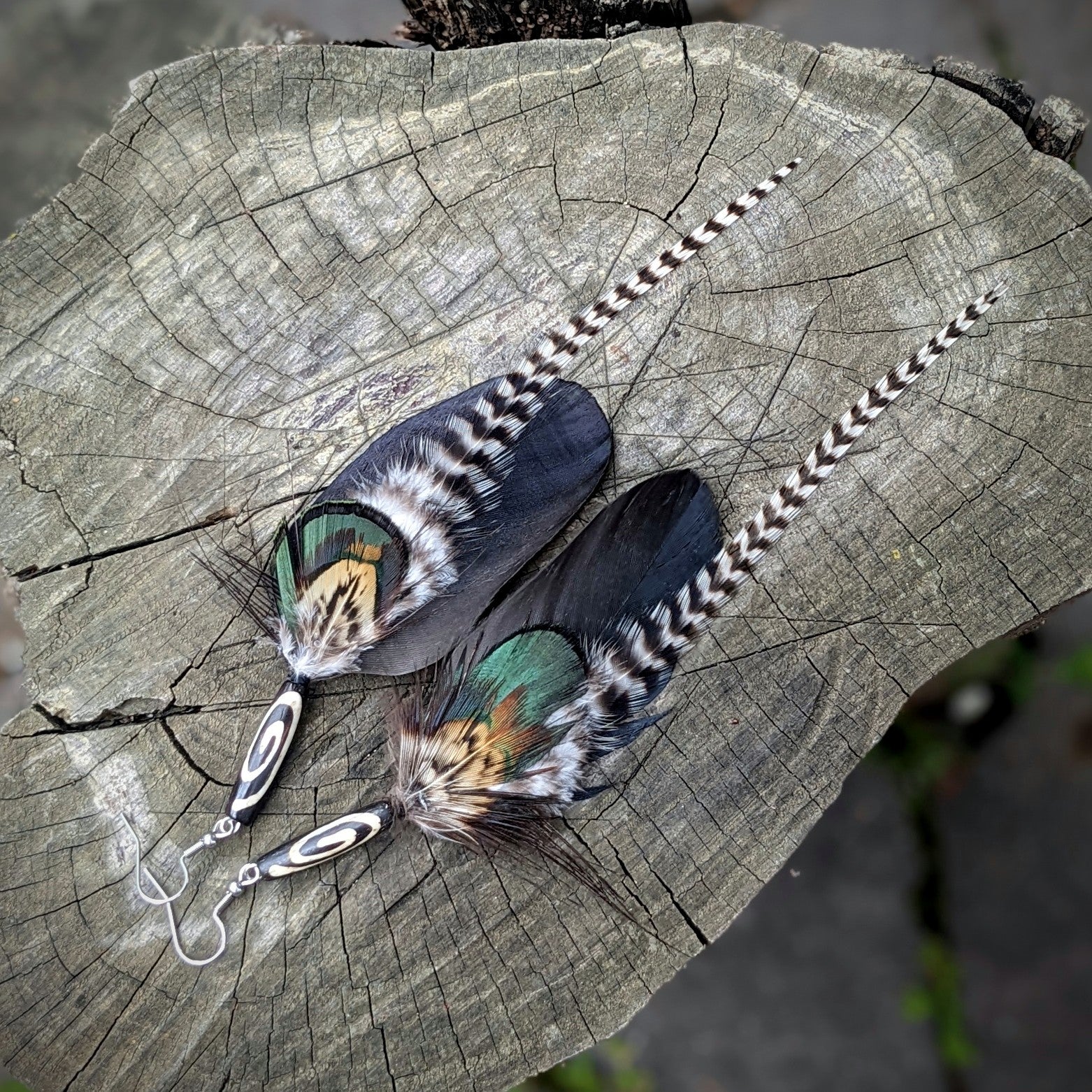 Distinctive feather earrings (pheasant, rooster, raven...) complemented by long bone beads. The hooks are made of surgical steel, and come with silicone stoppers. The length of the decorative part of the earrings is approximately 17 cm.