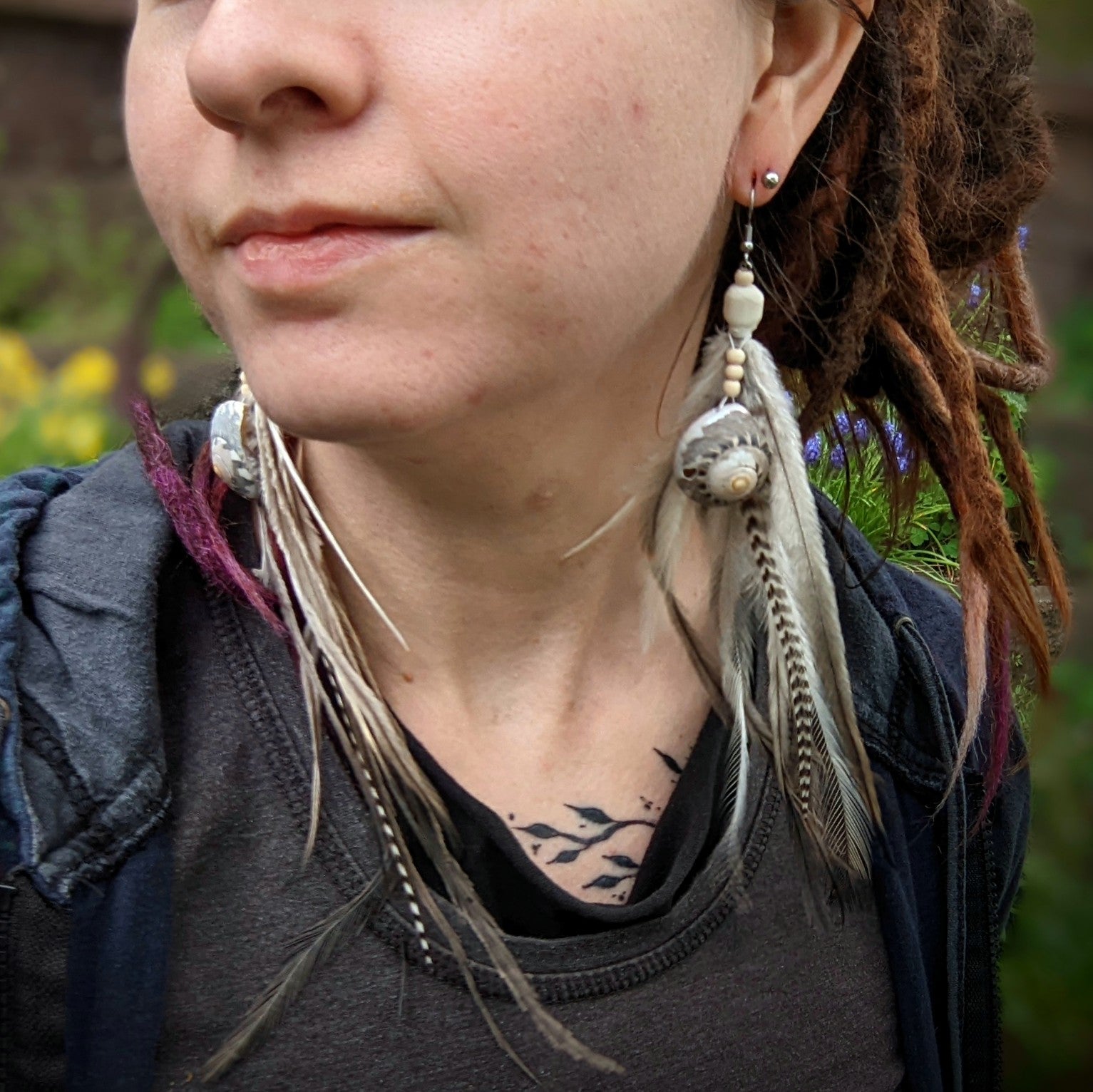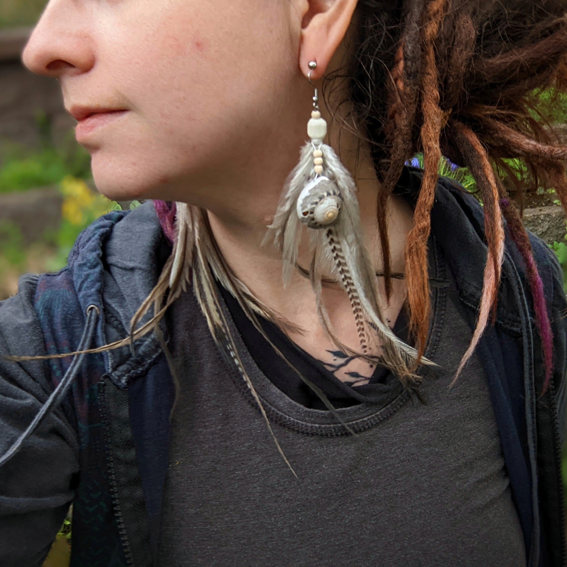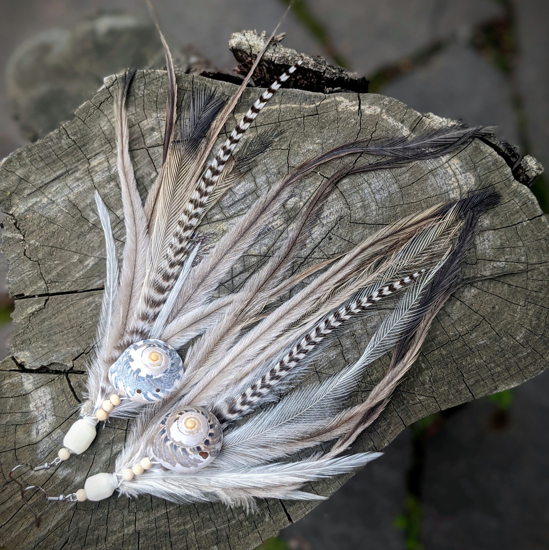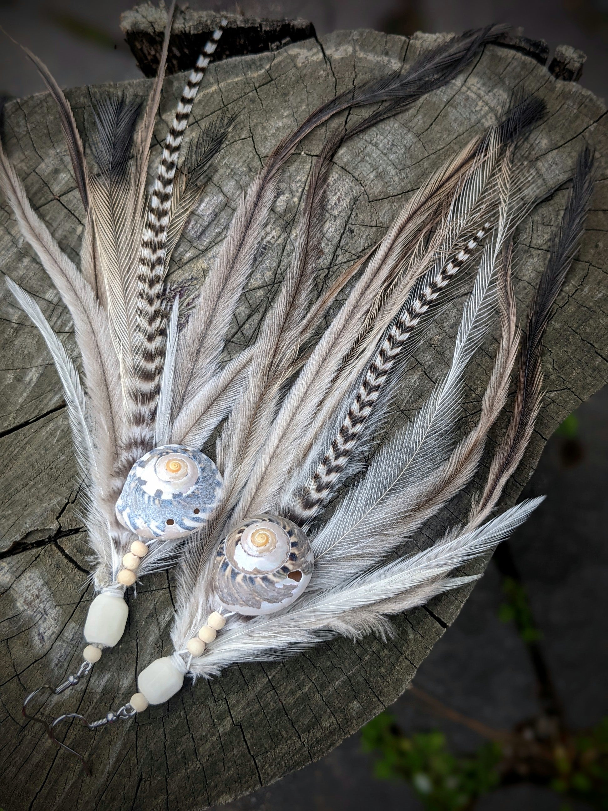 Distinctive feather earrings (emu, rooster...) complemented by bone and wooden beads and shells. The hooks are made of surgical steel, and come with silicone stoppers. The length of the decorative part of the earrings is approximately 20 cm.