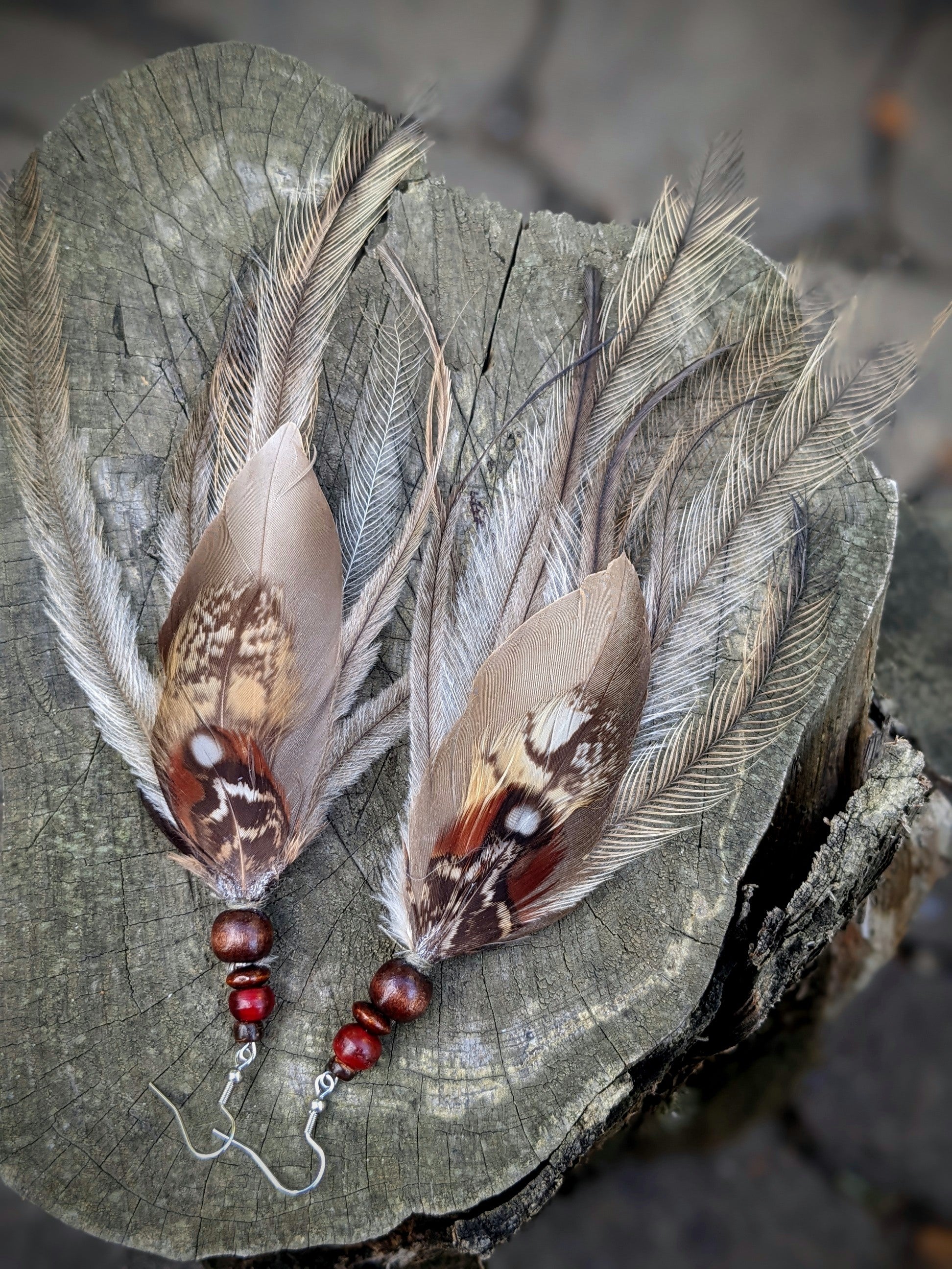 Distinctive feather earrings (emu, duck, owl, pheasant...) complemented by wood and horn beads. Hooks are made of surgical steel, supplied with silicone stoppers. The length of the decorative part of the earrings is approximately 23 cm.