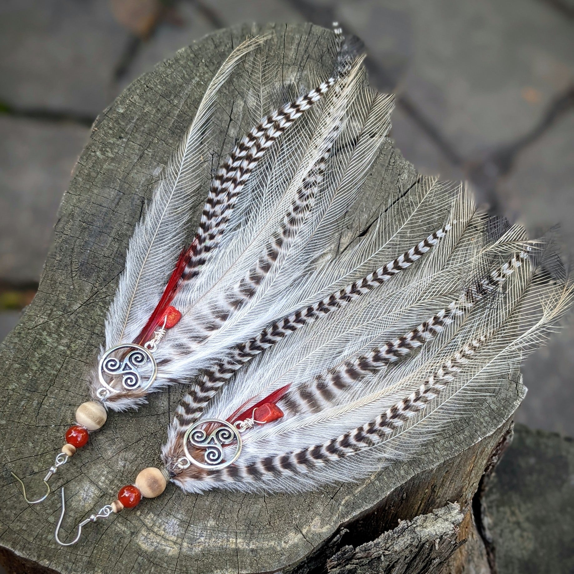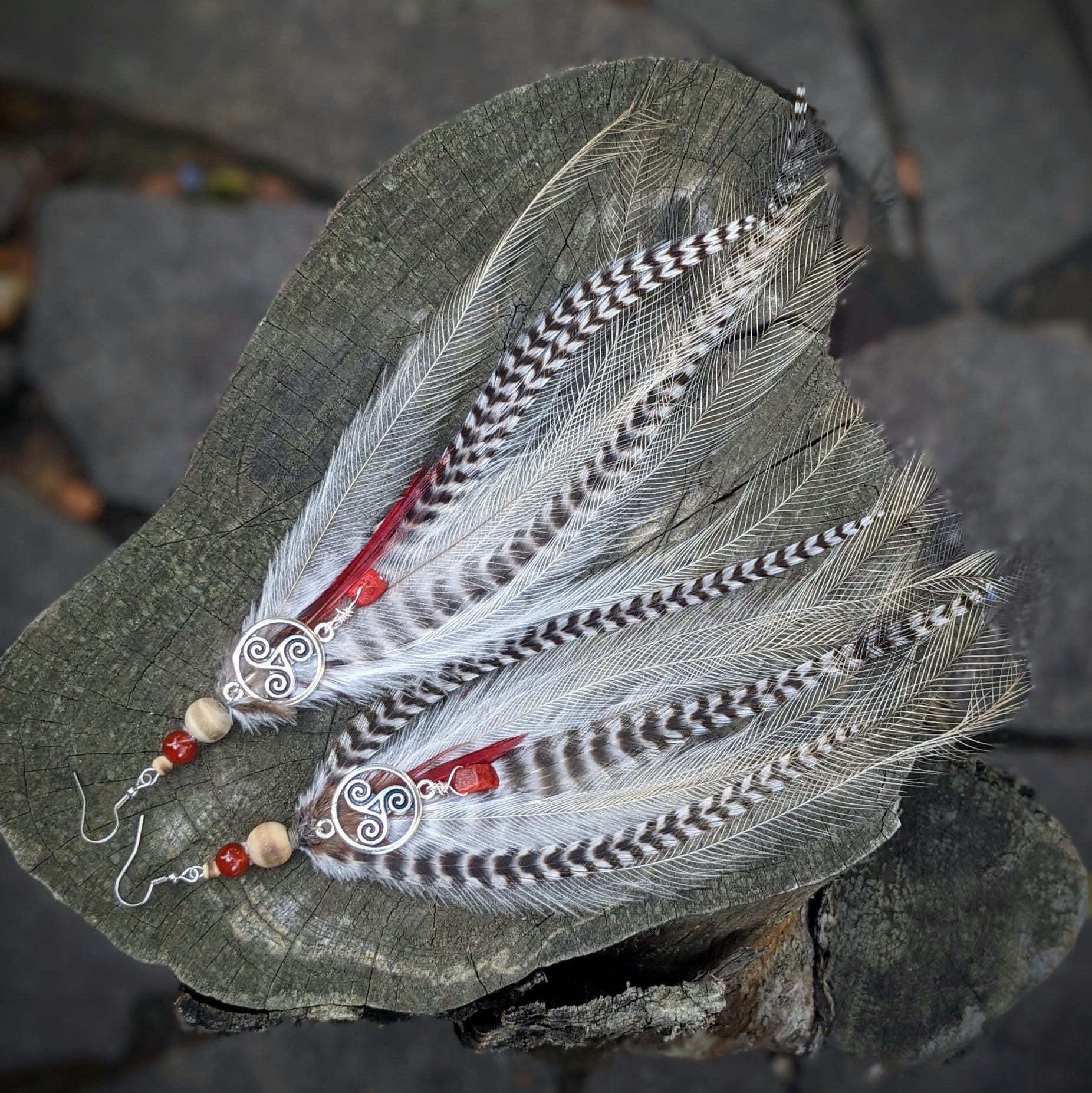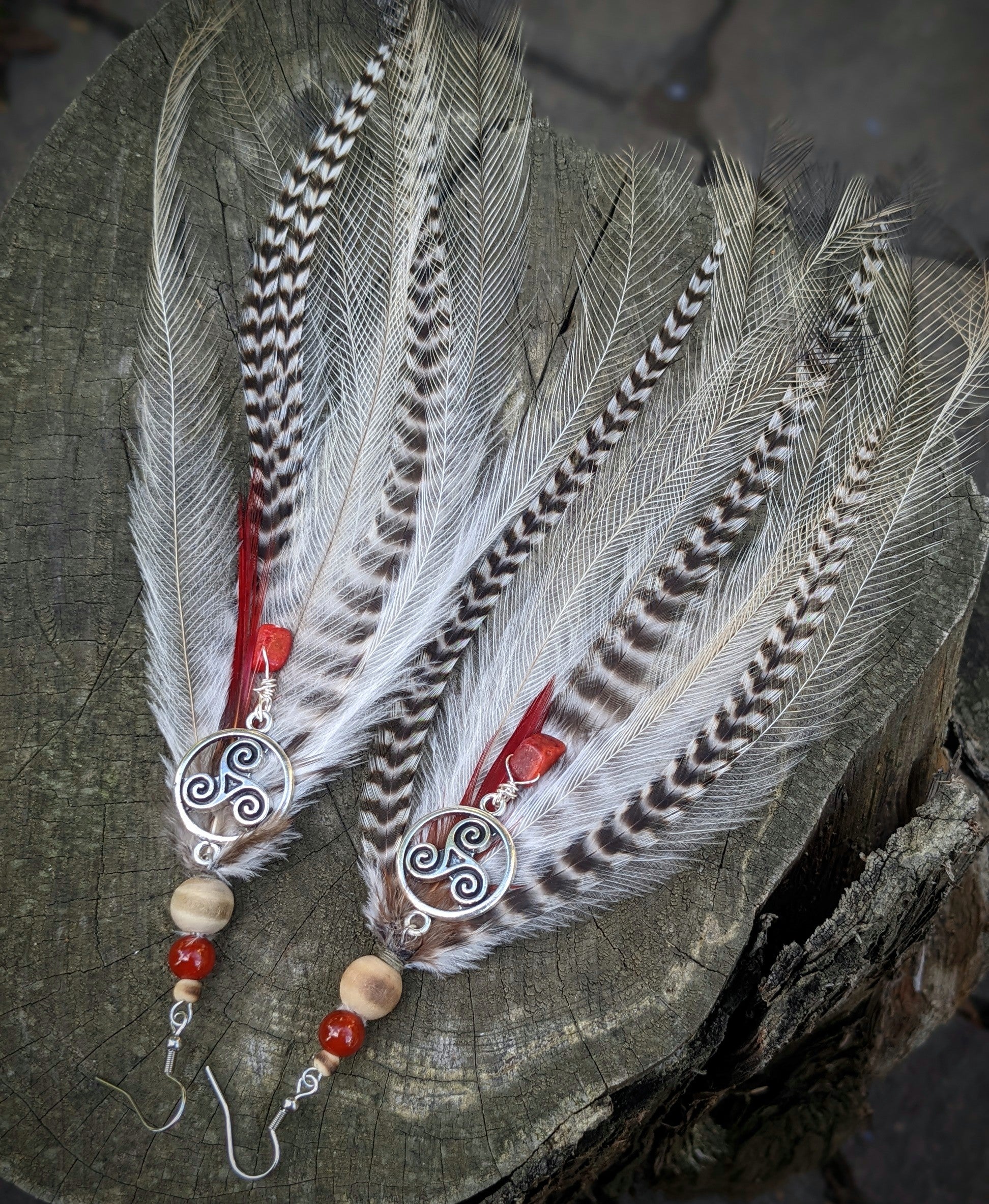 Distinctive feather earrings (emu, rooster, pheasant...) with a triskelion complemented by beads made of wood, carnelian and mushroom coral. The hooks are made of surgical steel, and come with silicone stoppers. The length of the decorative part of the earrings is approximately 23 cm.