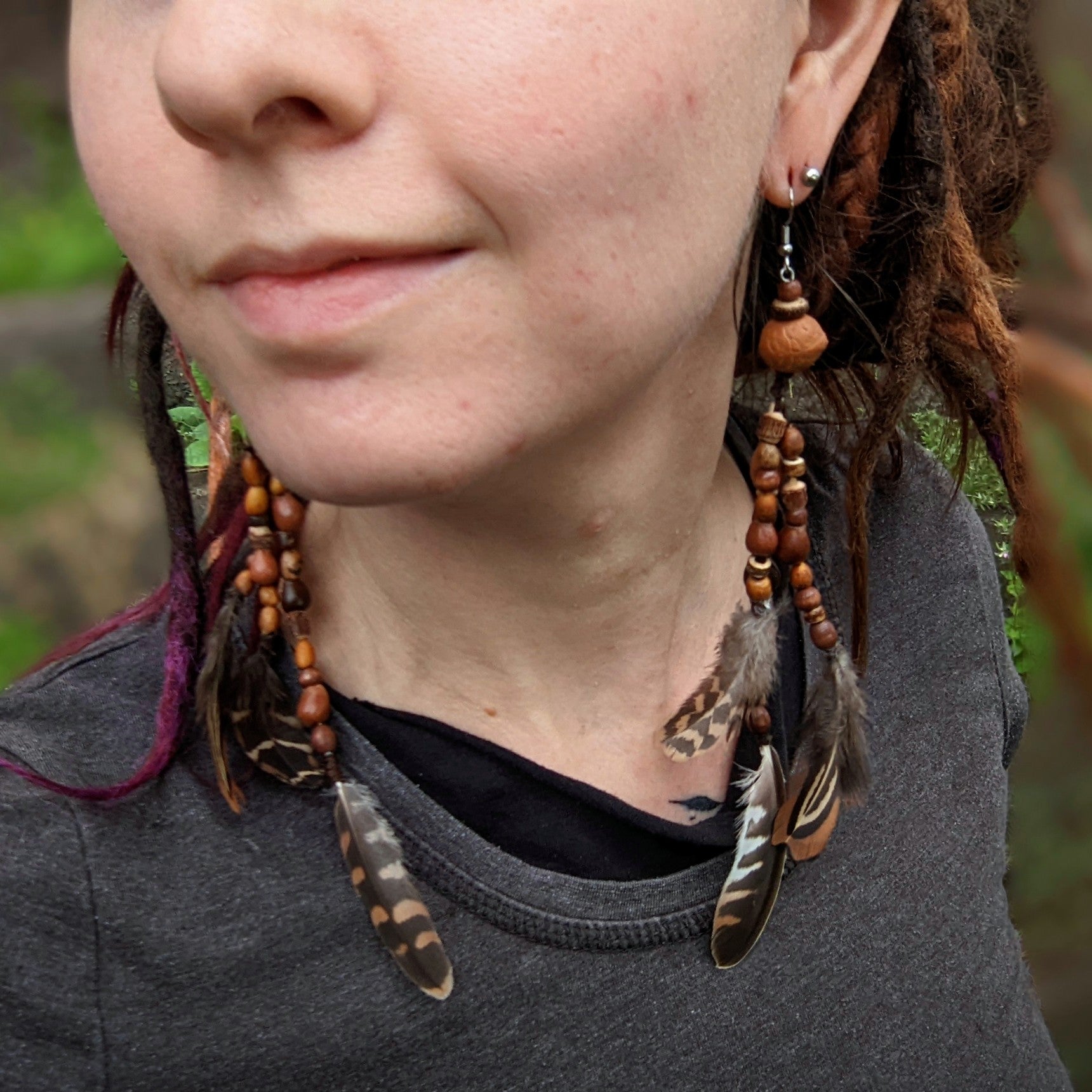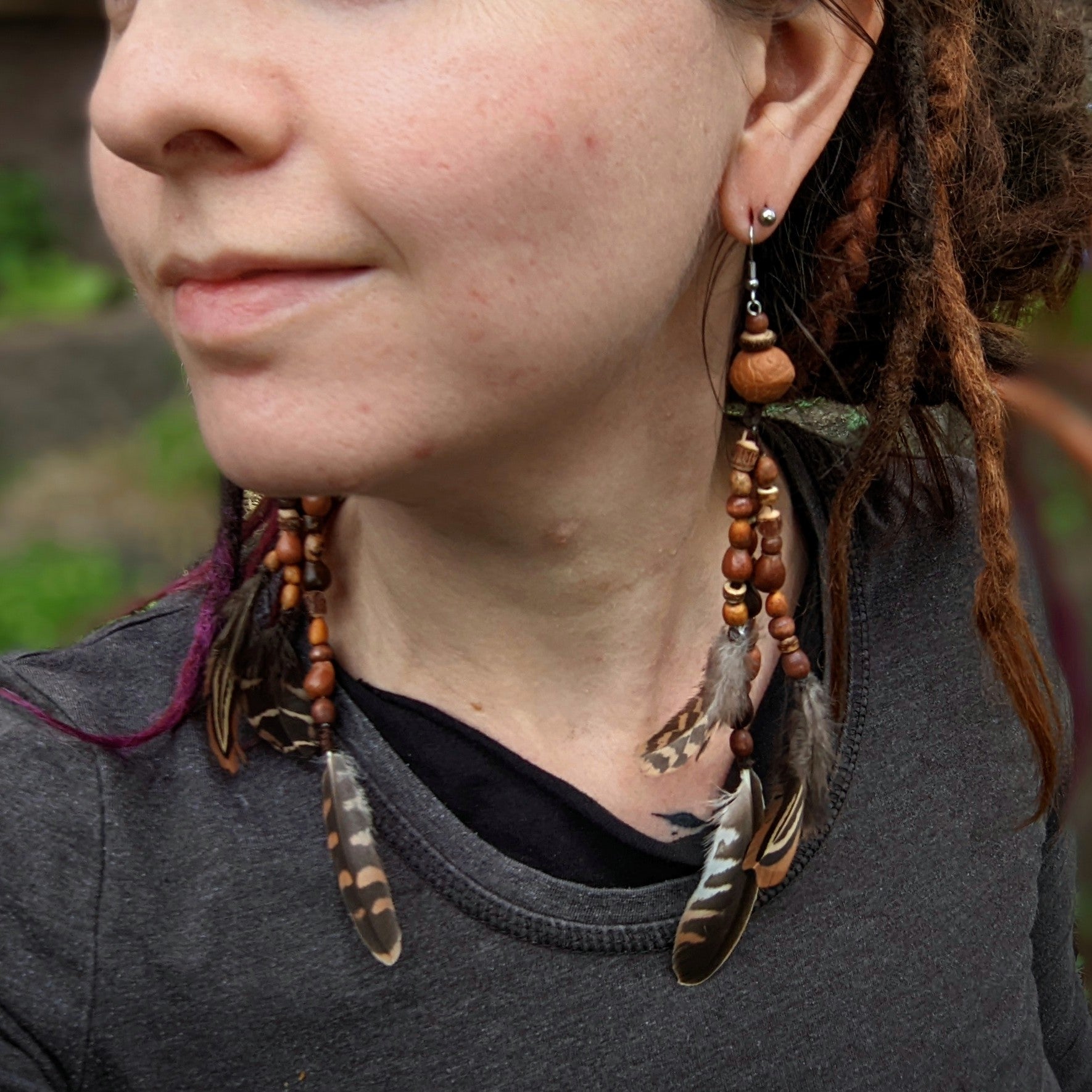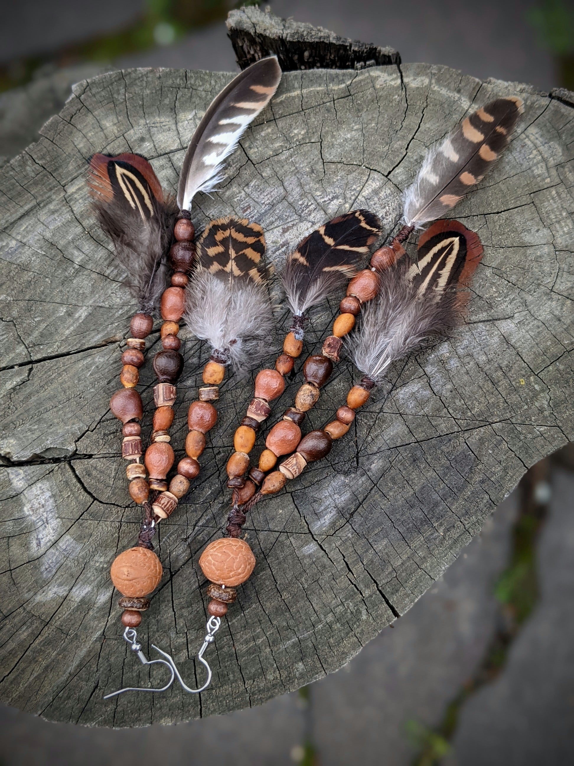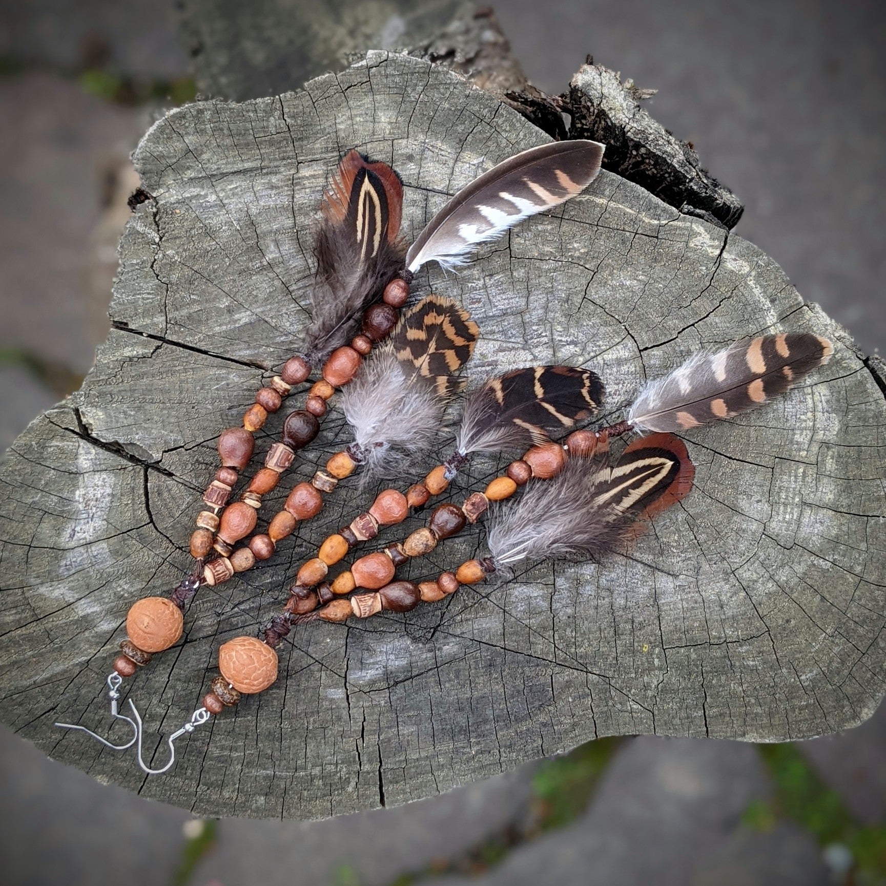 Feather earrings (bird, pheasant...) inspired by the forest - complemented by beads made of sedge, basil, gall and wooden beads. The hooks are made of surgical steel, and come with silicone stoppers. The length of the decorative part of the earrings is approximately 19 cm.