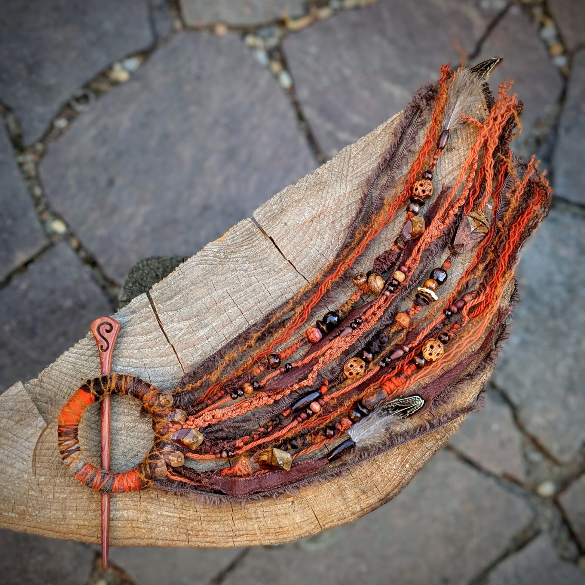 A hair and dreadlock clip, consisting of a wooden ring and a decorative pin. I always create clips richly decorated with yarn and sheep's wool, with beads made of natural materials and with feathers. The color, length and style of decoration is according to your wishes. I always choose the pin in a color that matches the order - according to stock.