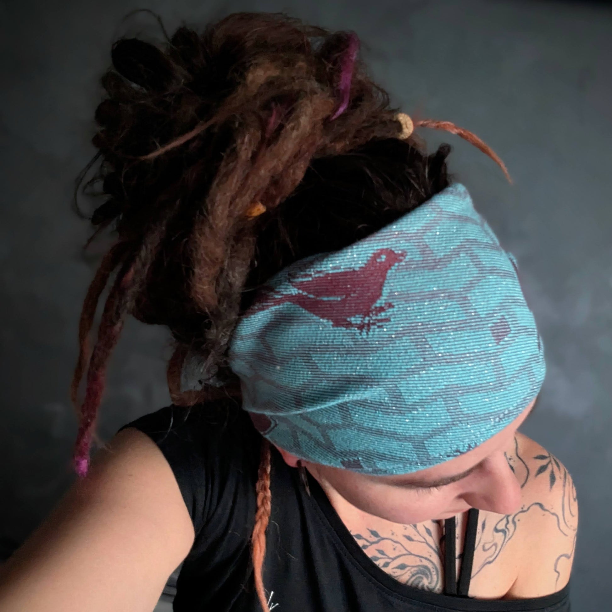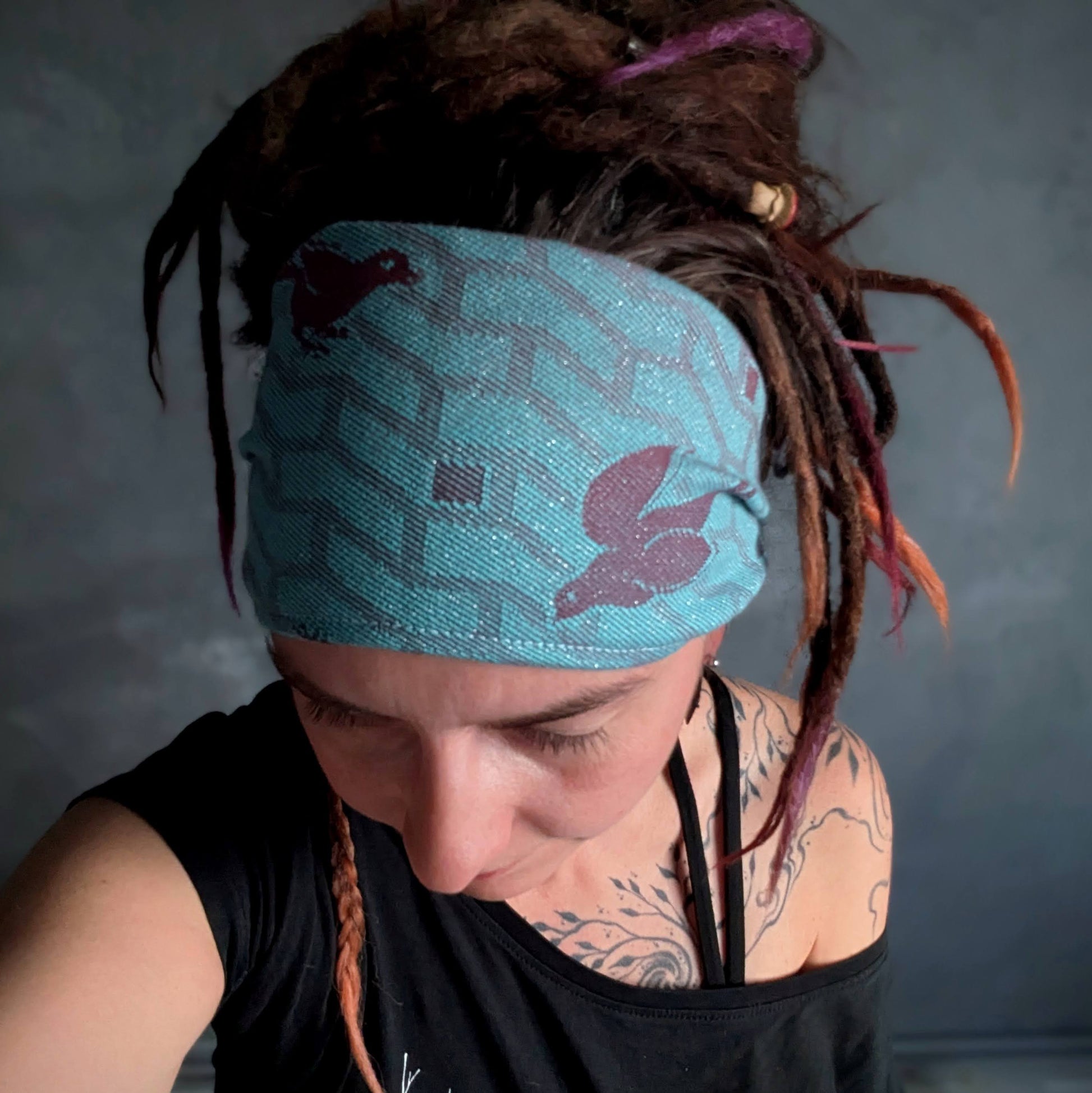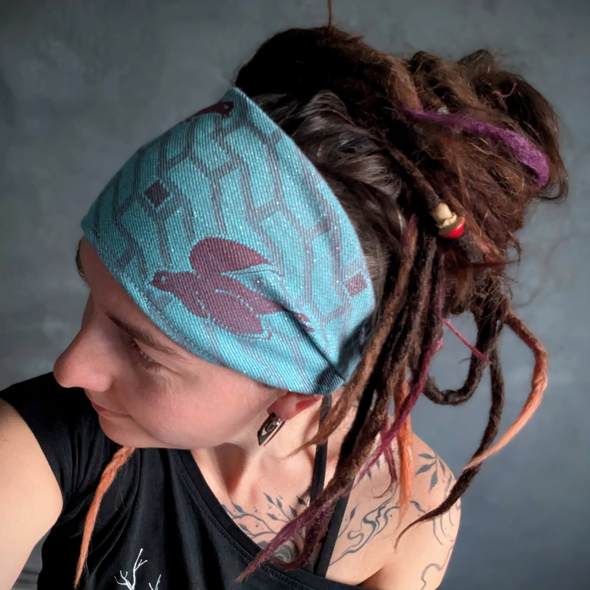Practical scarf headband sewn from a babywearing scarf cutout (Yaro brand).