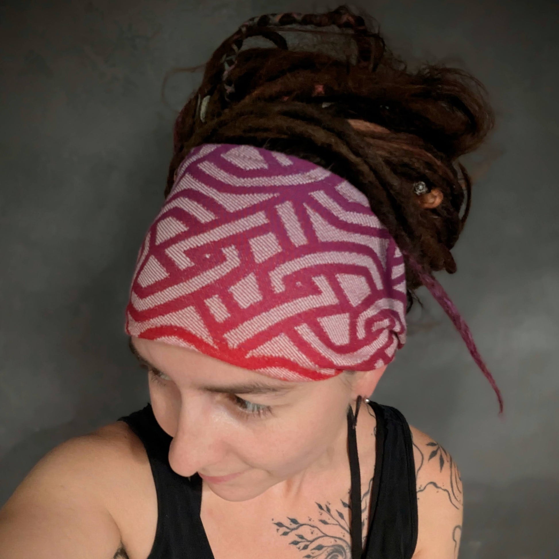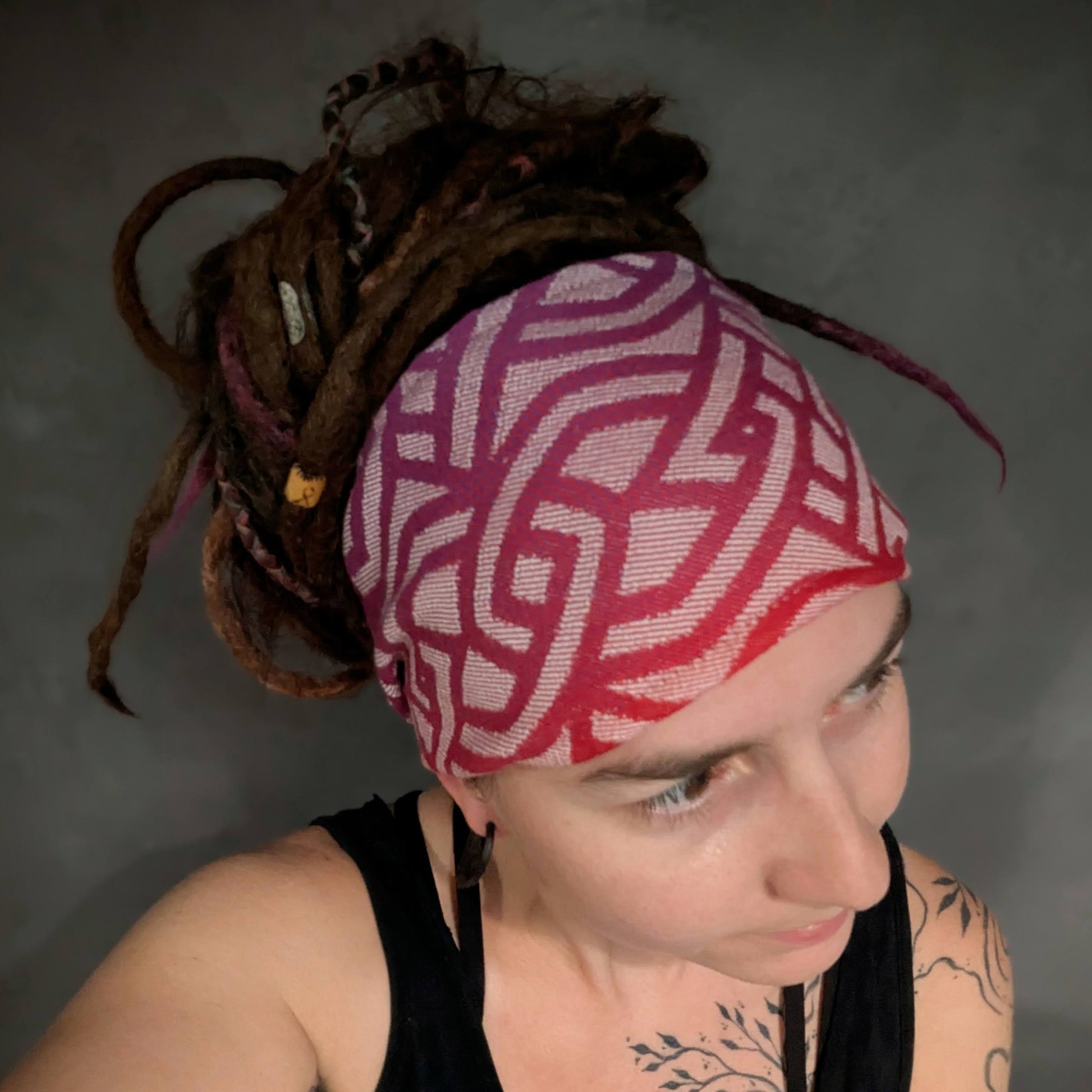Practical scarf headband sewn from a babywearing scarf cutout (Yaro brand).