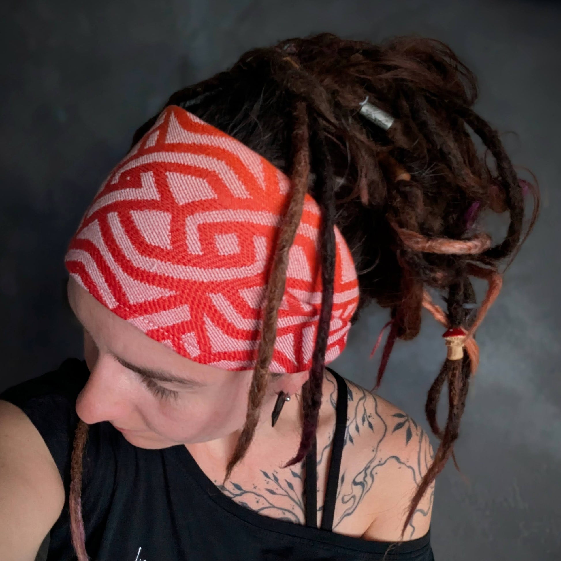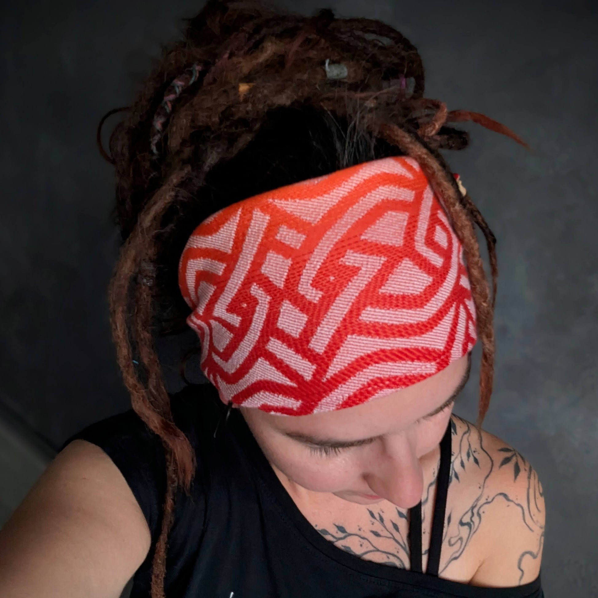 Practical scarf headband sewn from a babywearing scarf cutout (Yaro brand).