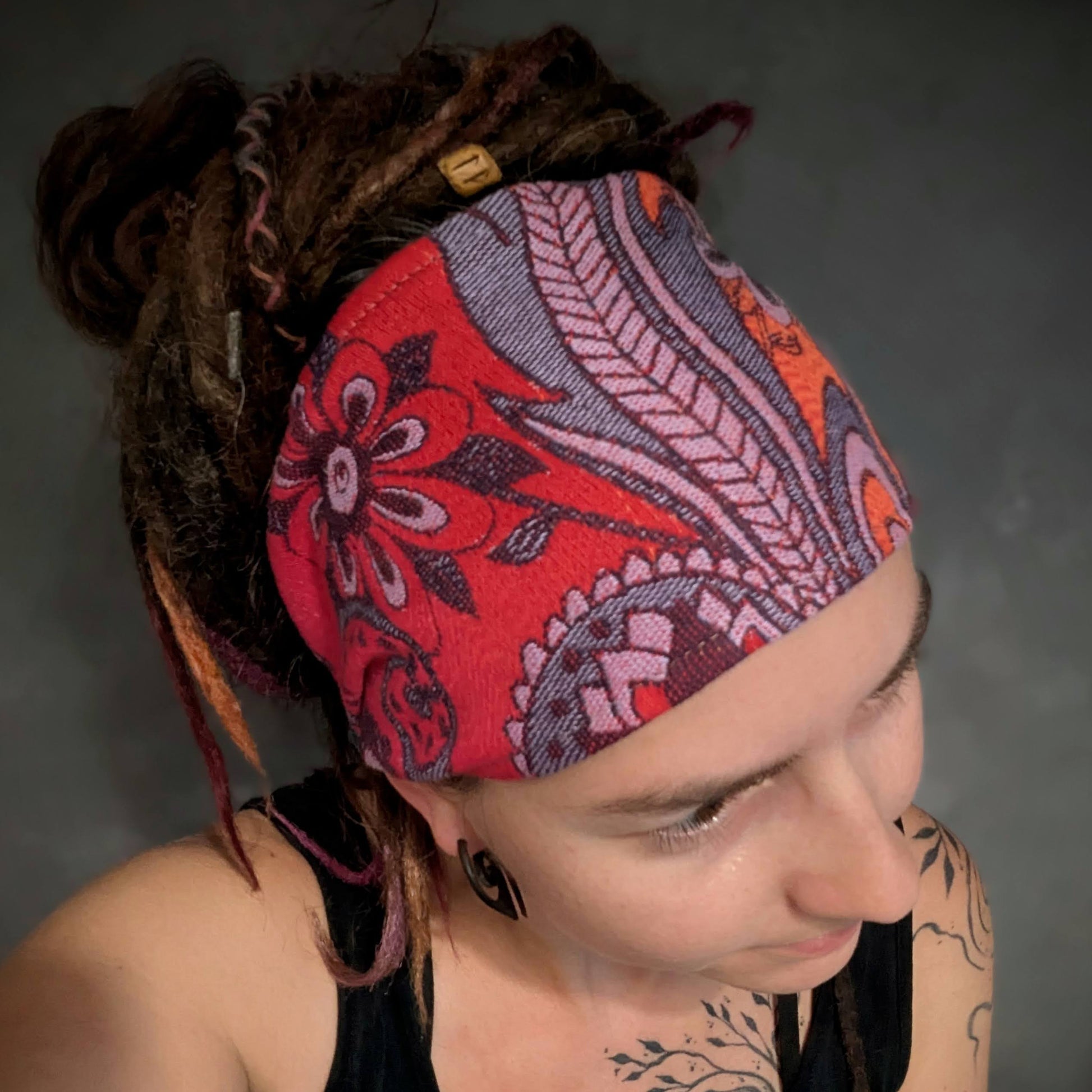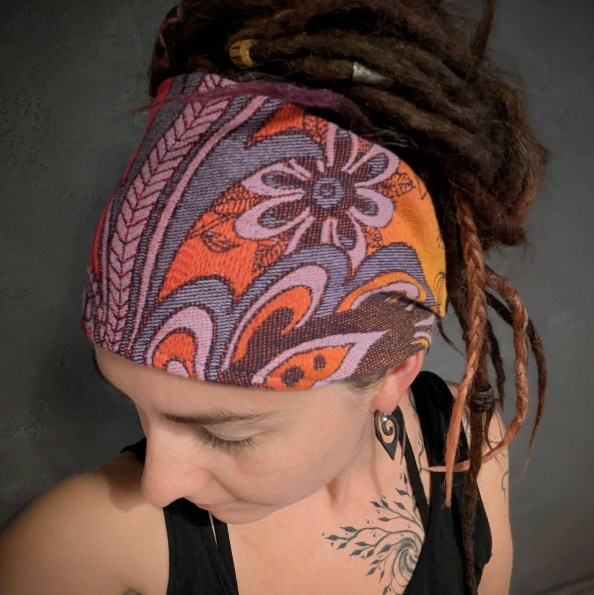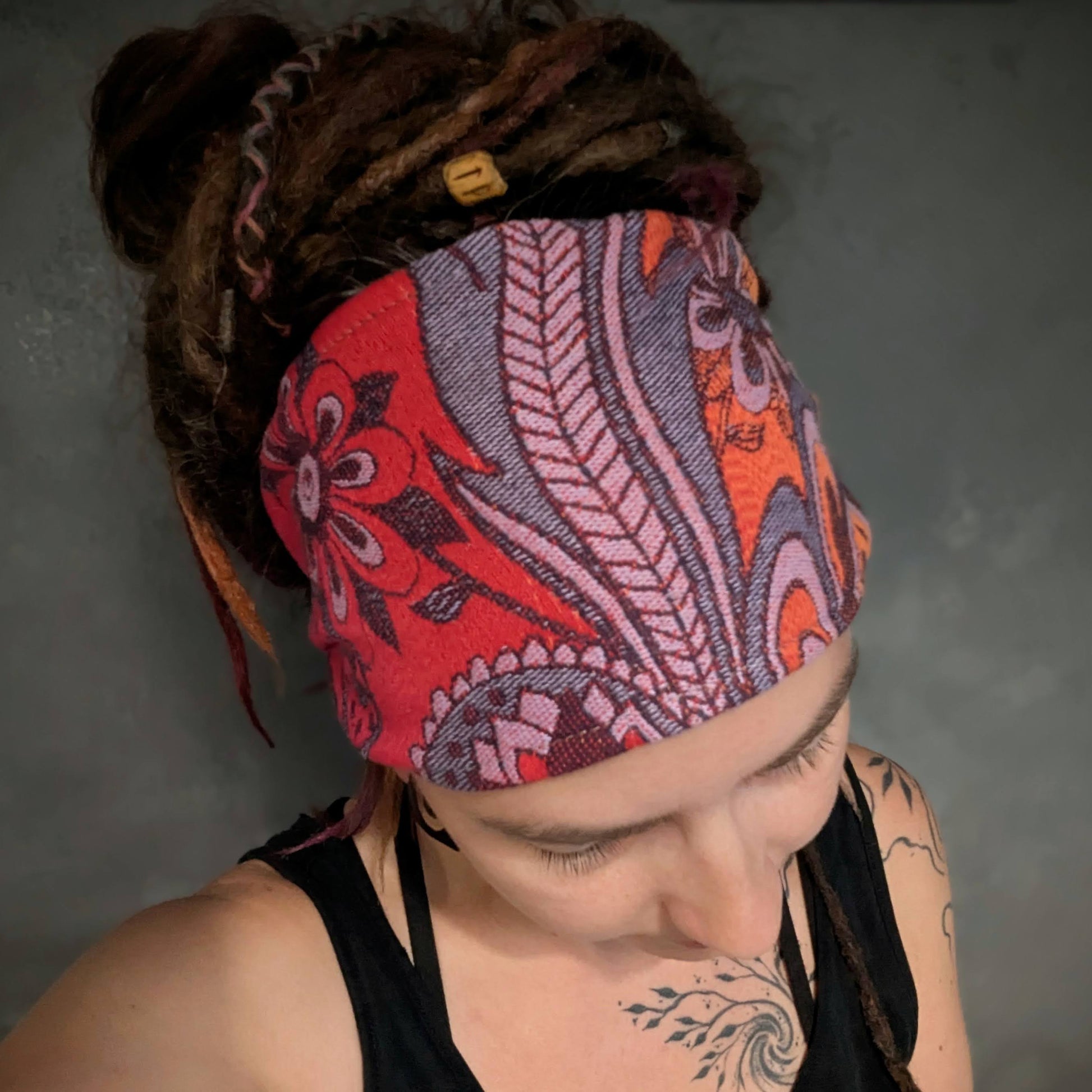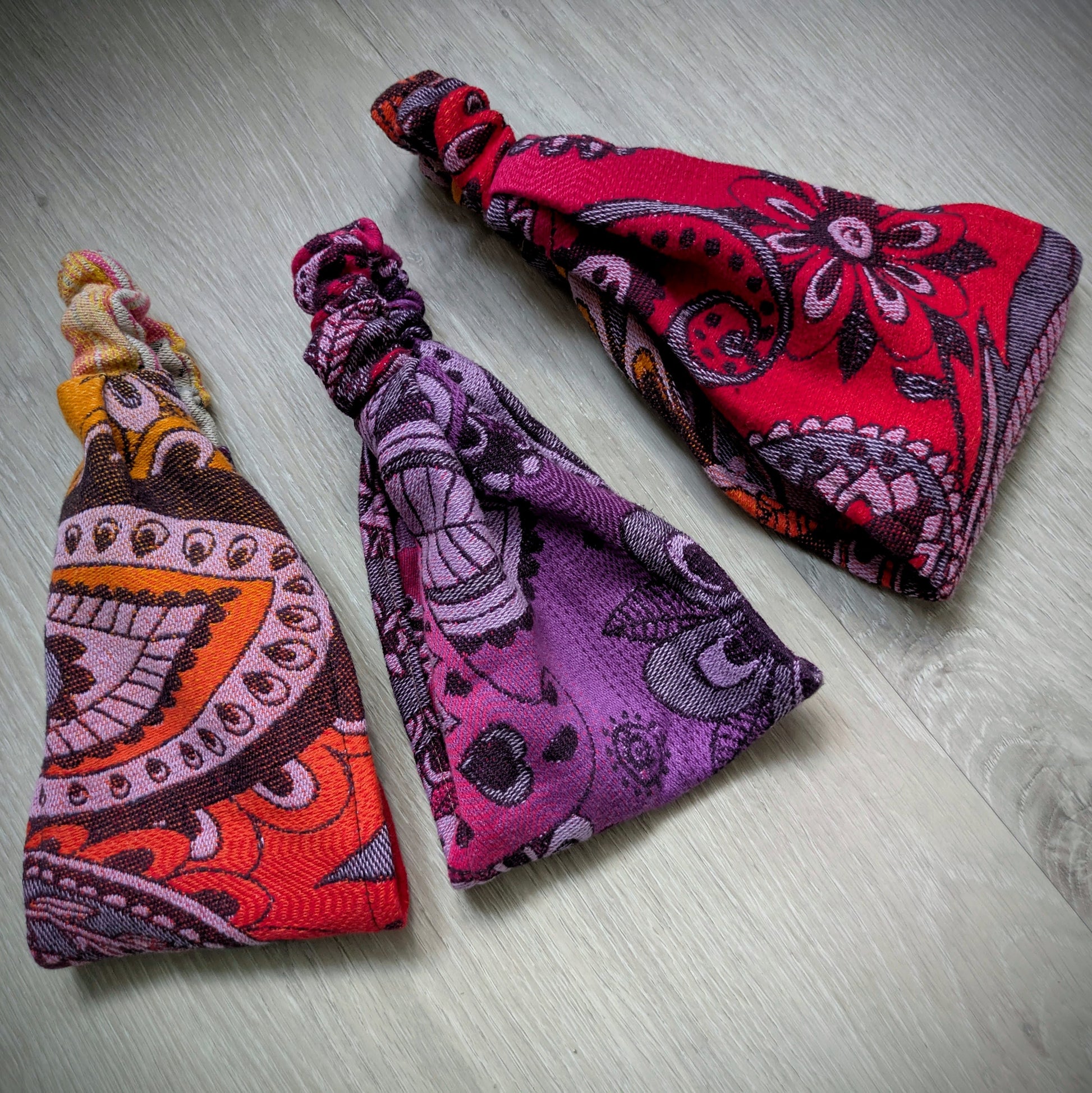 Practical scarf headband sewn from a babywearing scarf cutout (Natibaby brand).