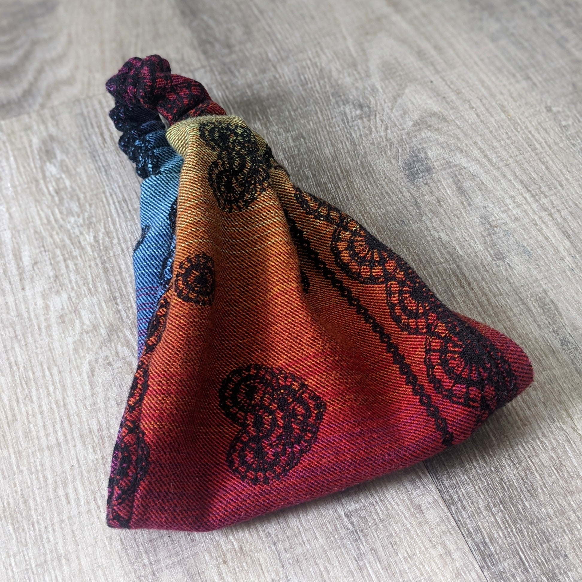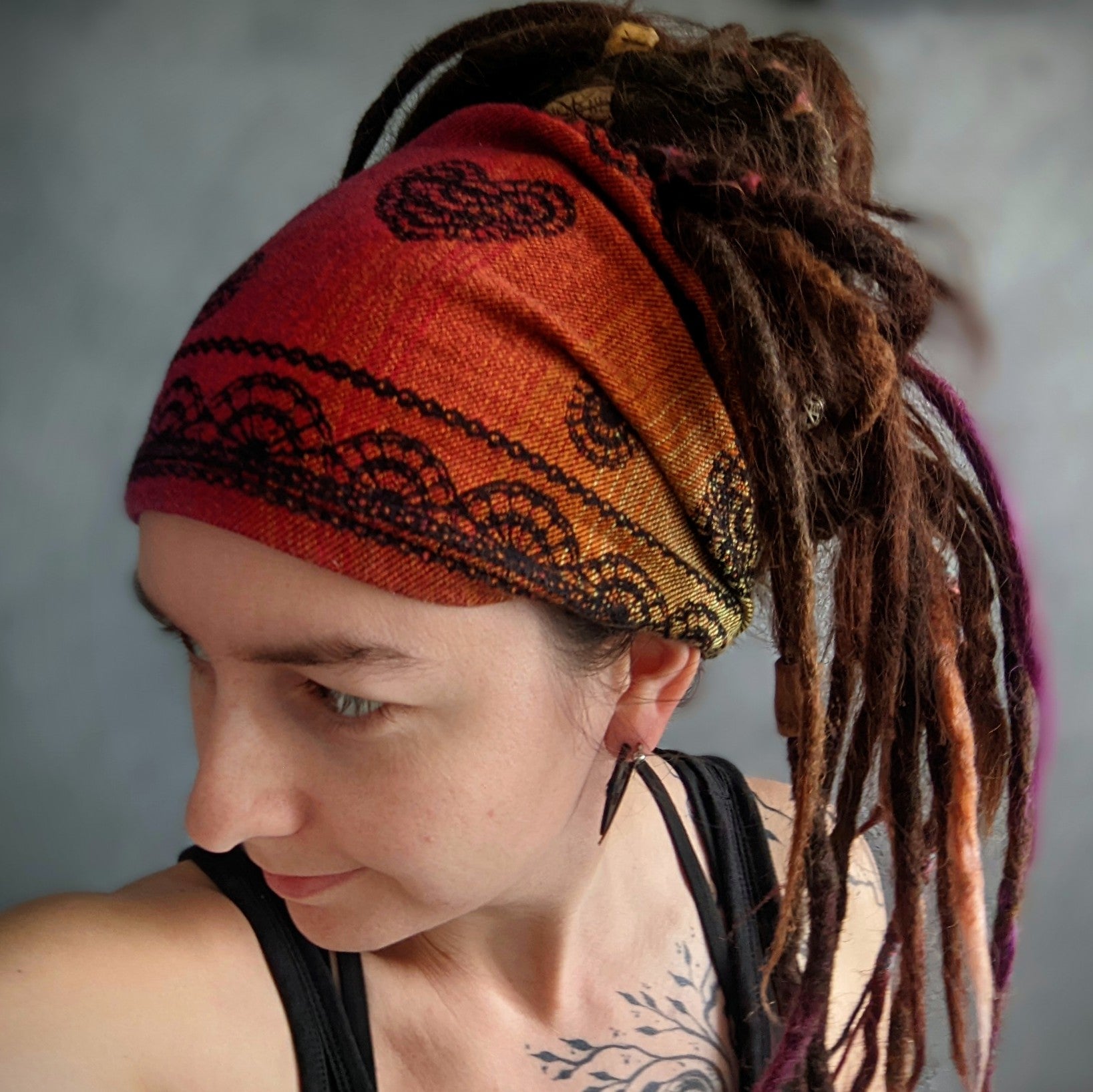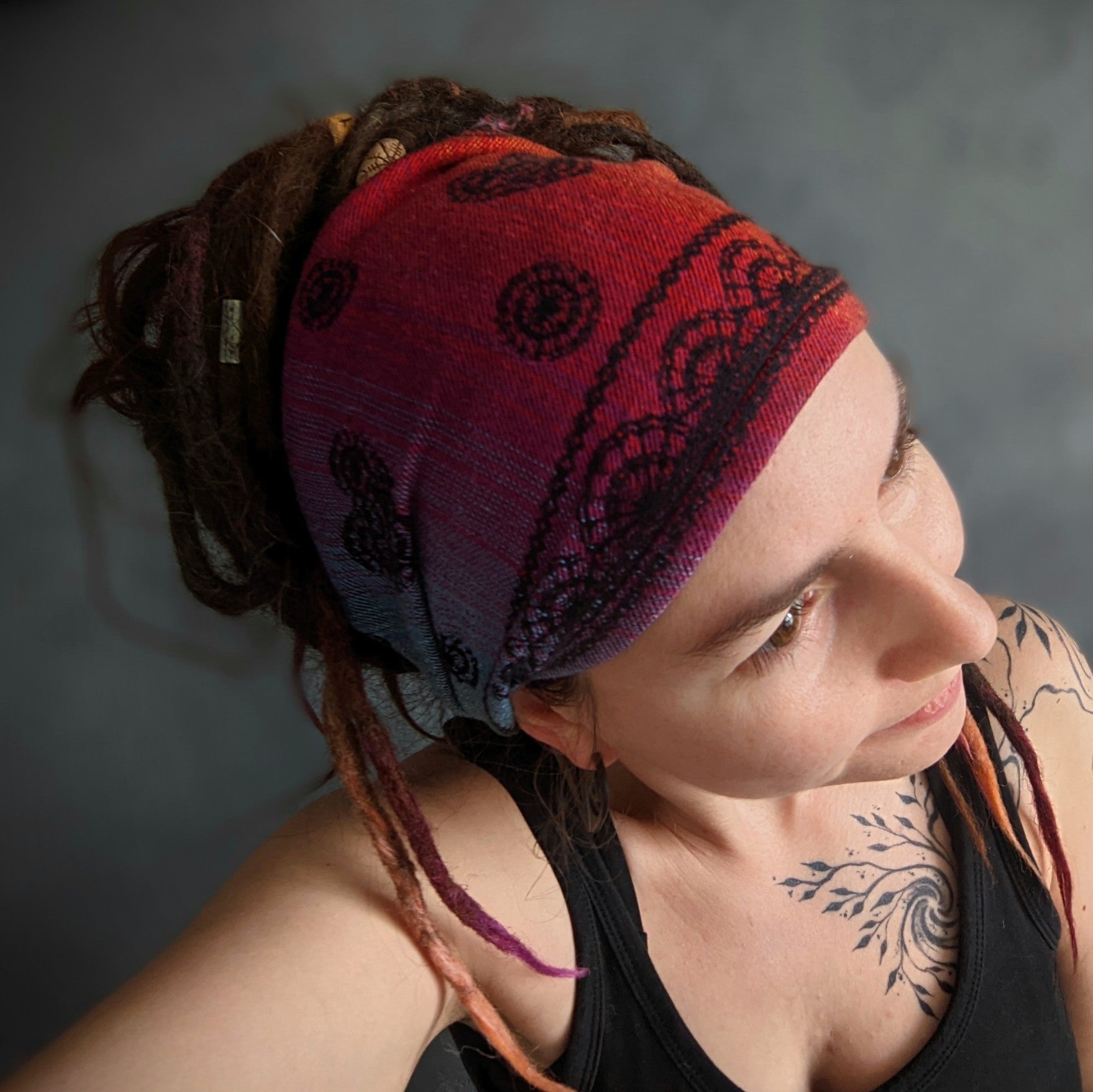 Practical scarf headband sewn from a babywearing scarf cutout.