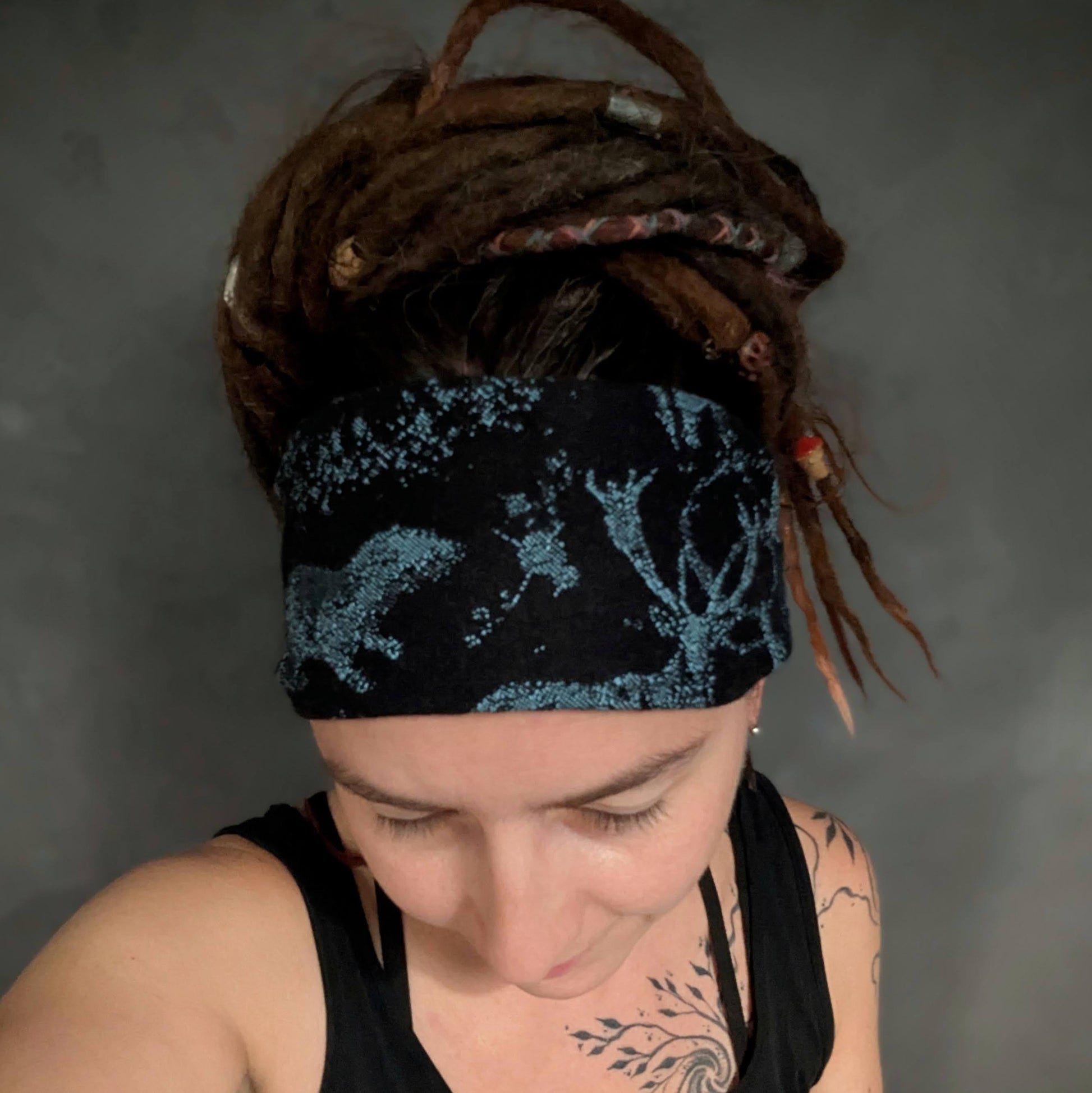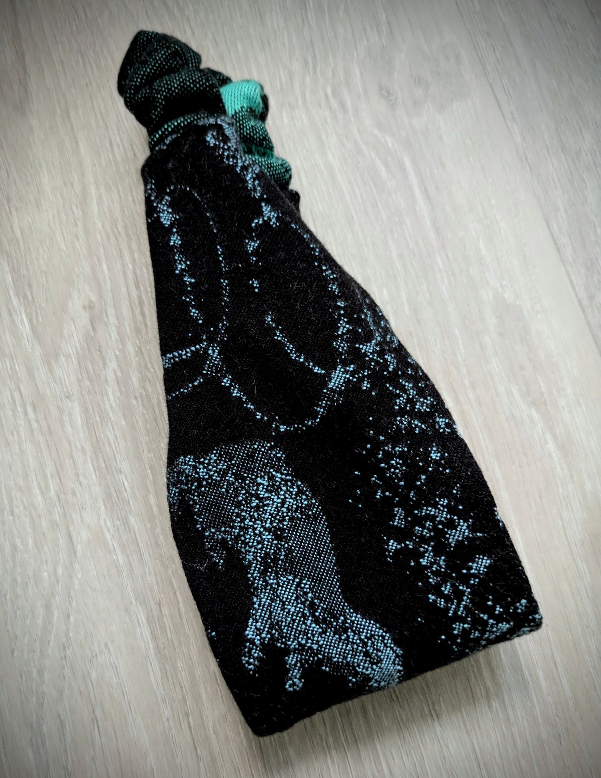 Practical scarf headband sewn from a babywearing scarf cutout (Luluna brand).