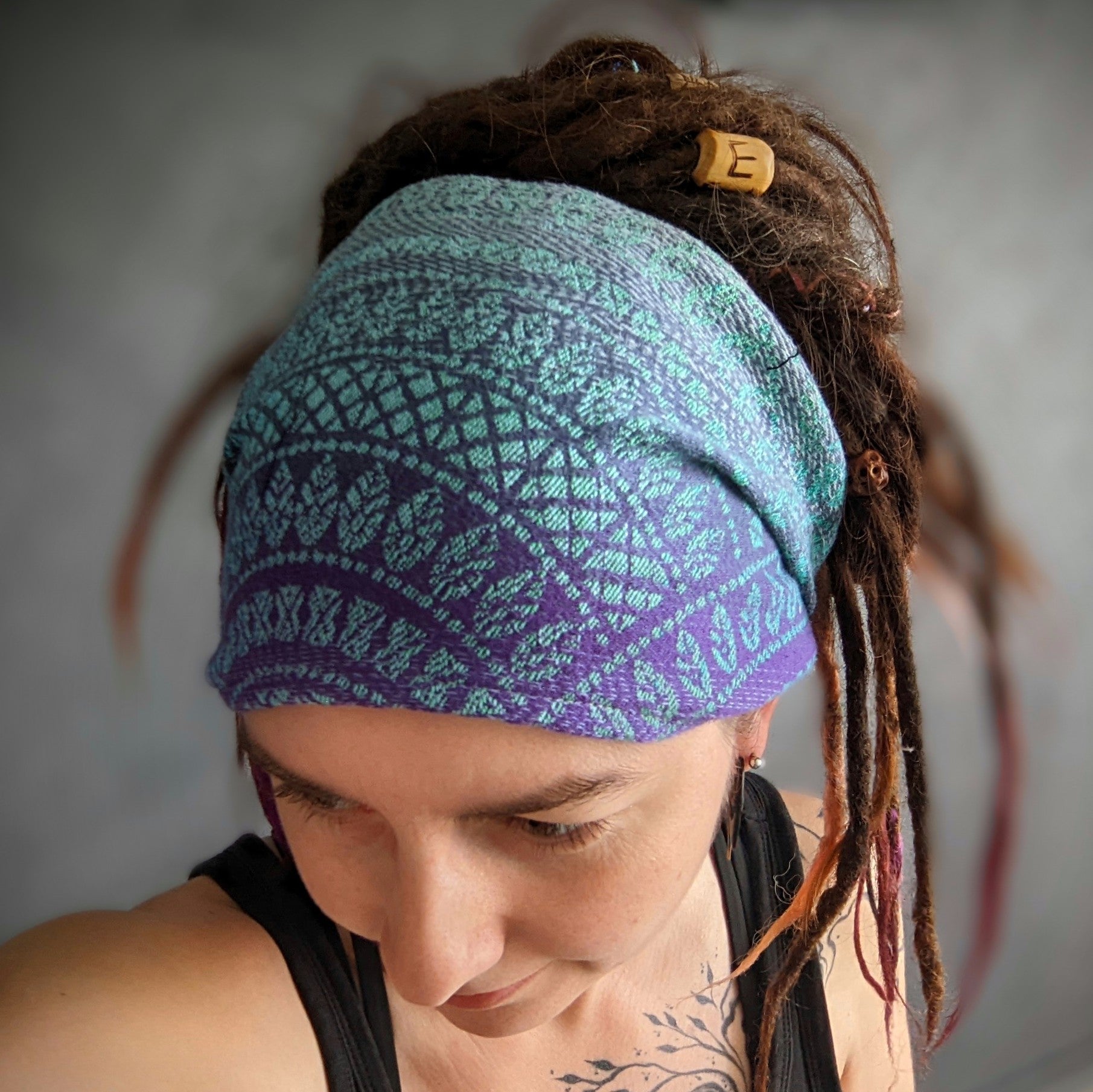 Practical scarf headband sewn from a babywearing scarf cutout.