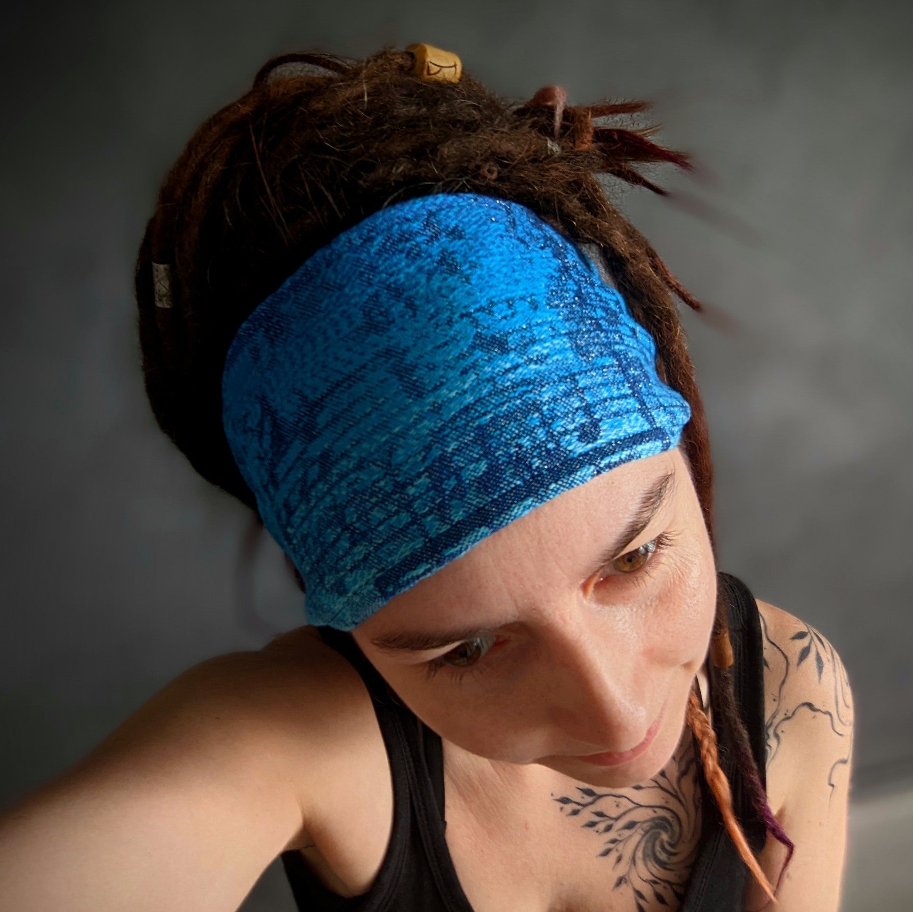 Practical scarf headband sewn from a babywearing scarf cutout.