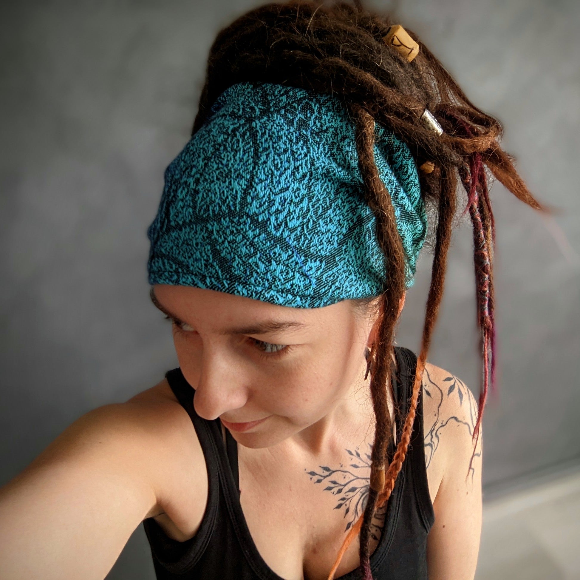 Practical scarf headband sewn from a babywearing scarf cutout.