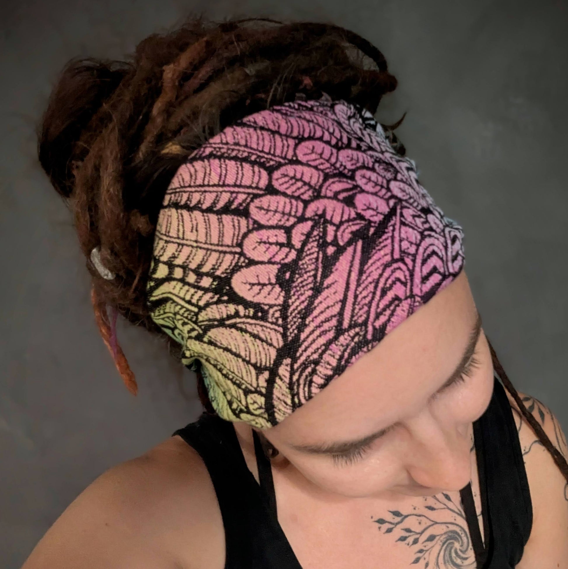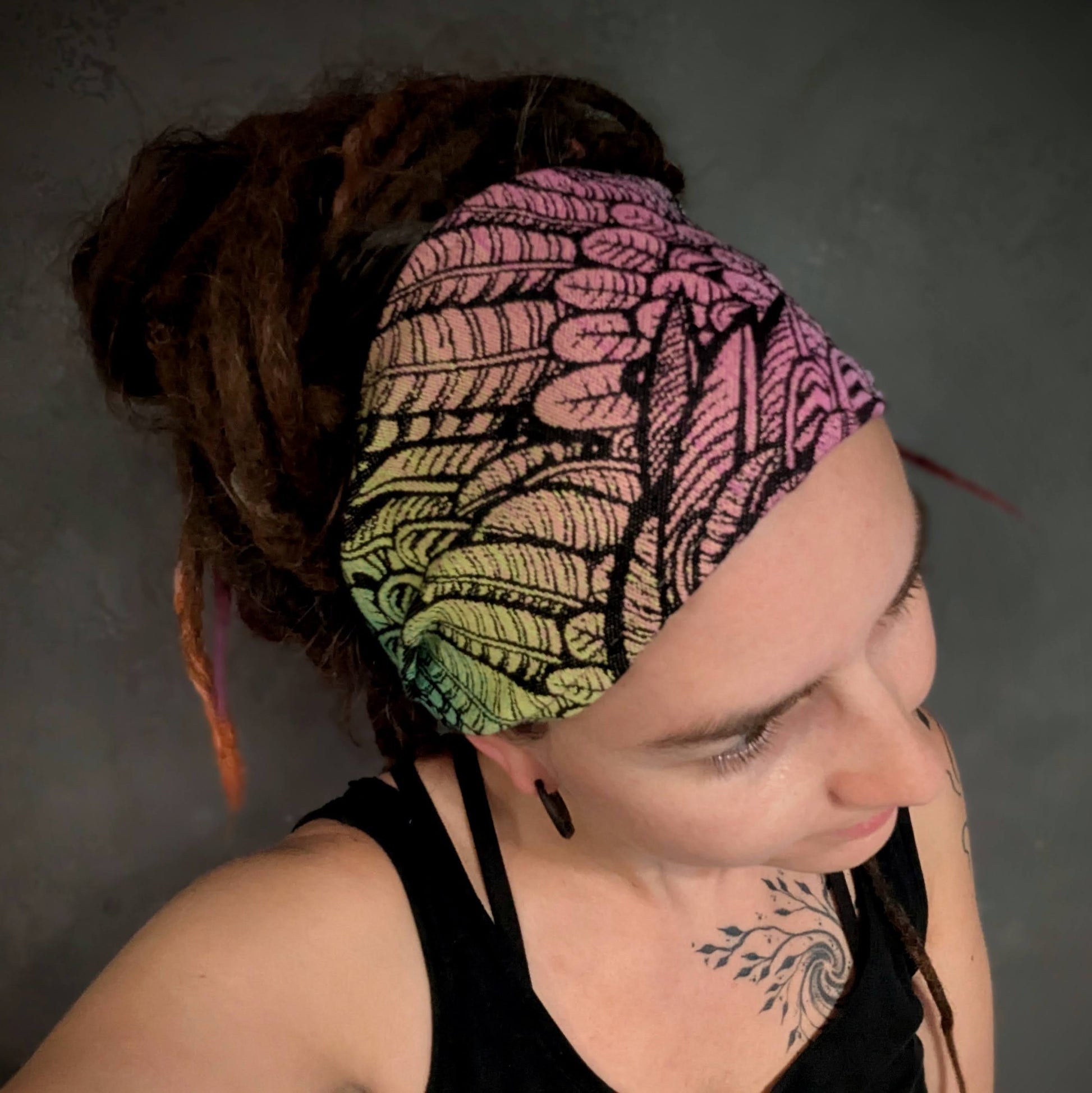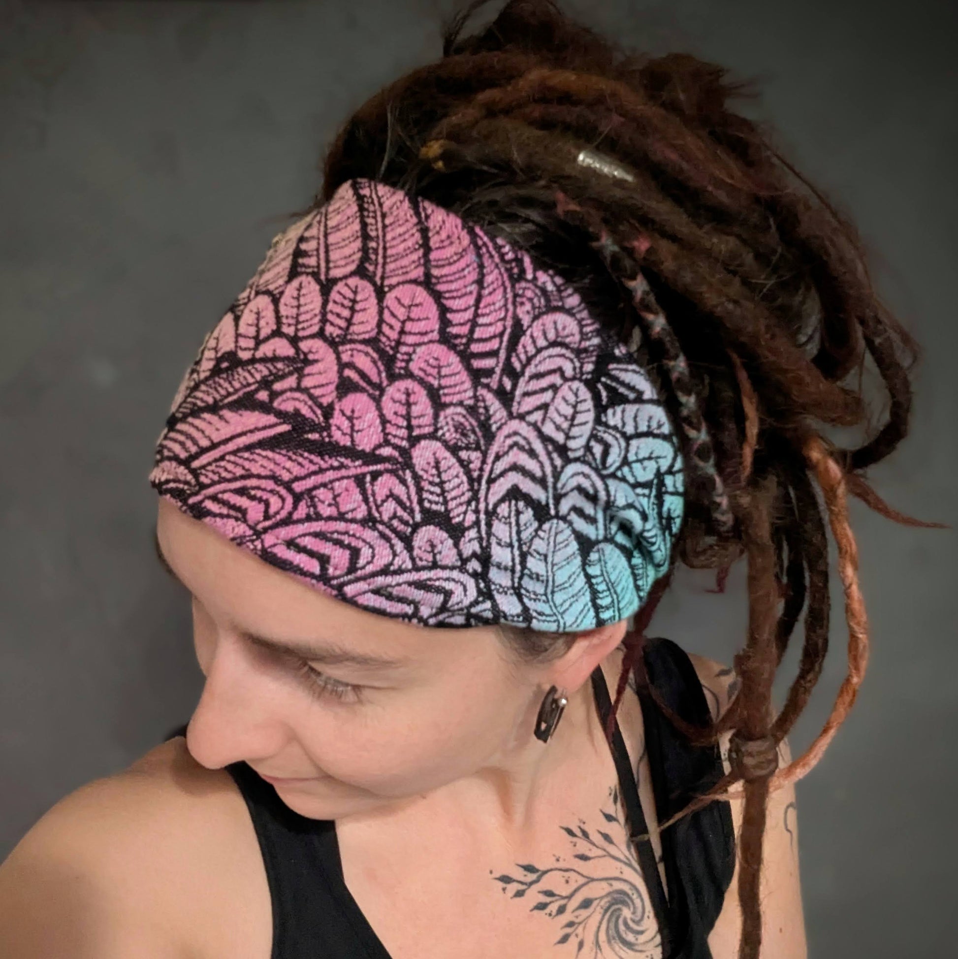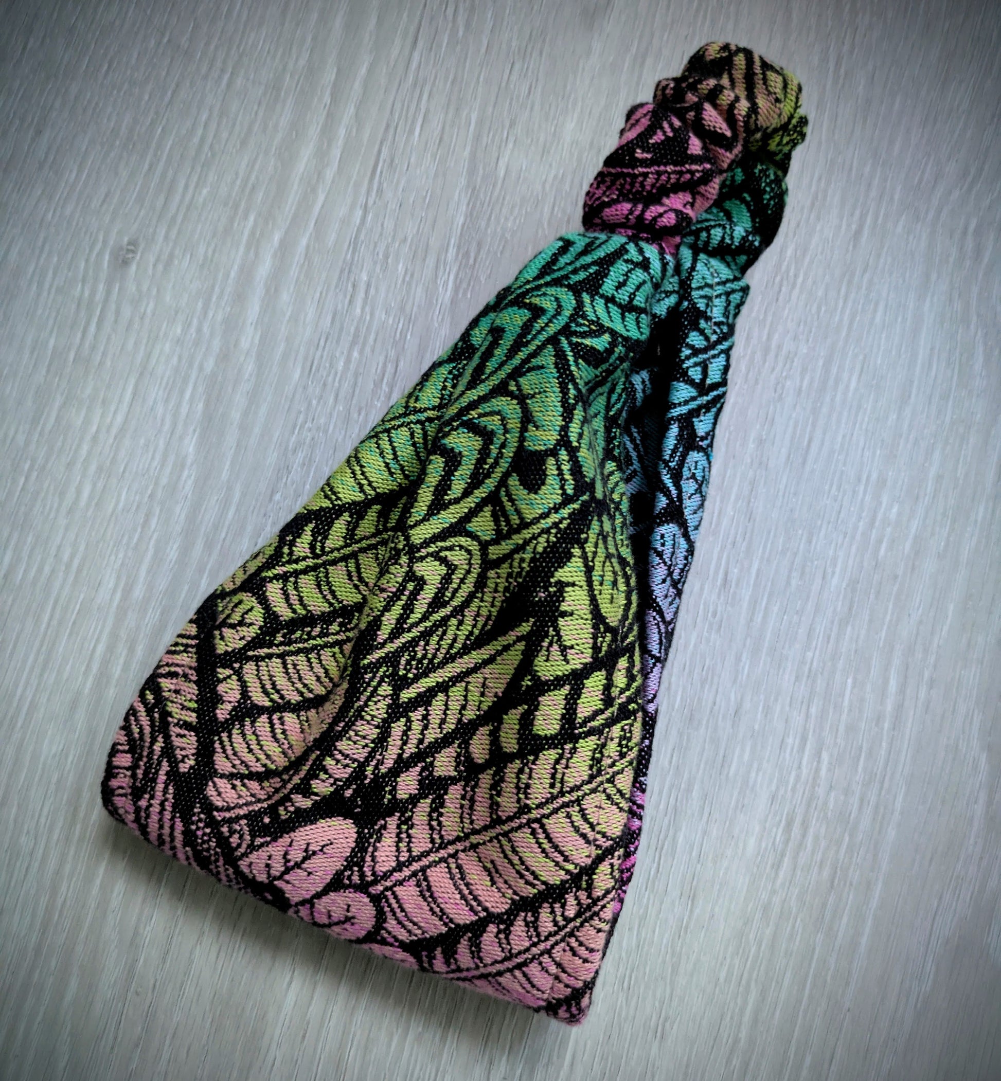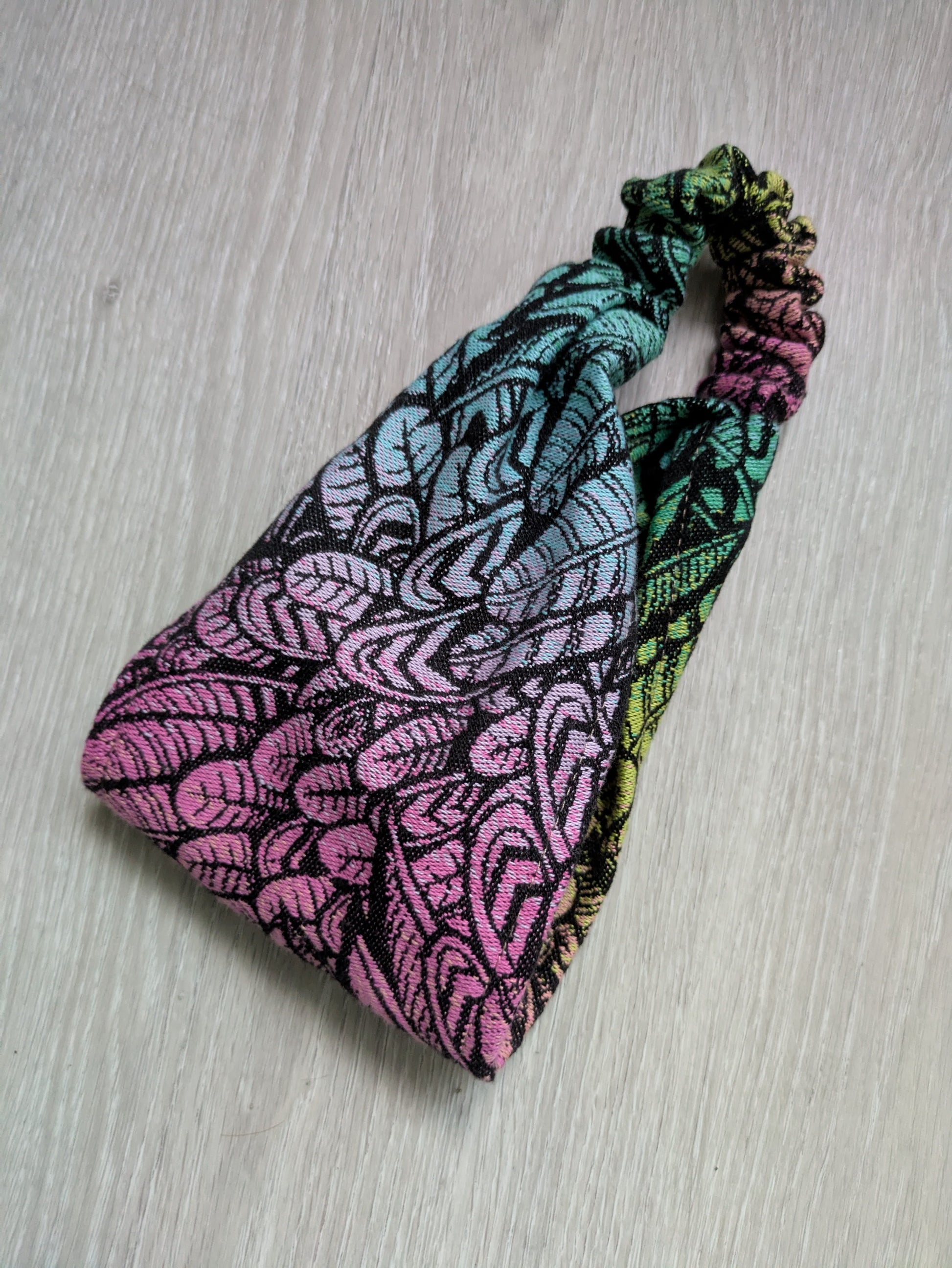 Practical scarf headband sewn from a babywearing scarf cutout (Lenny Lamb brand).