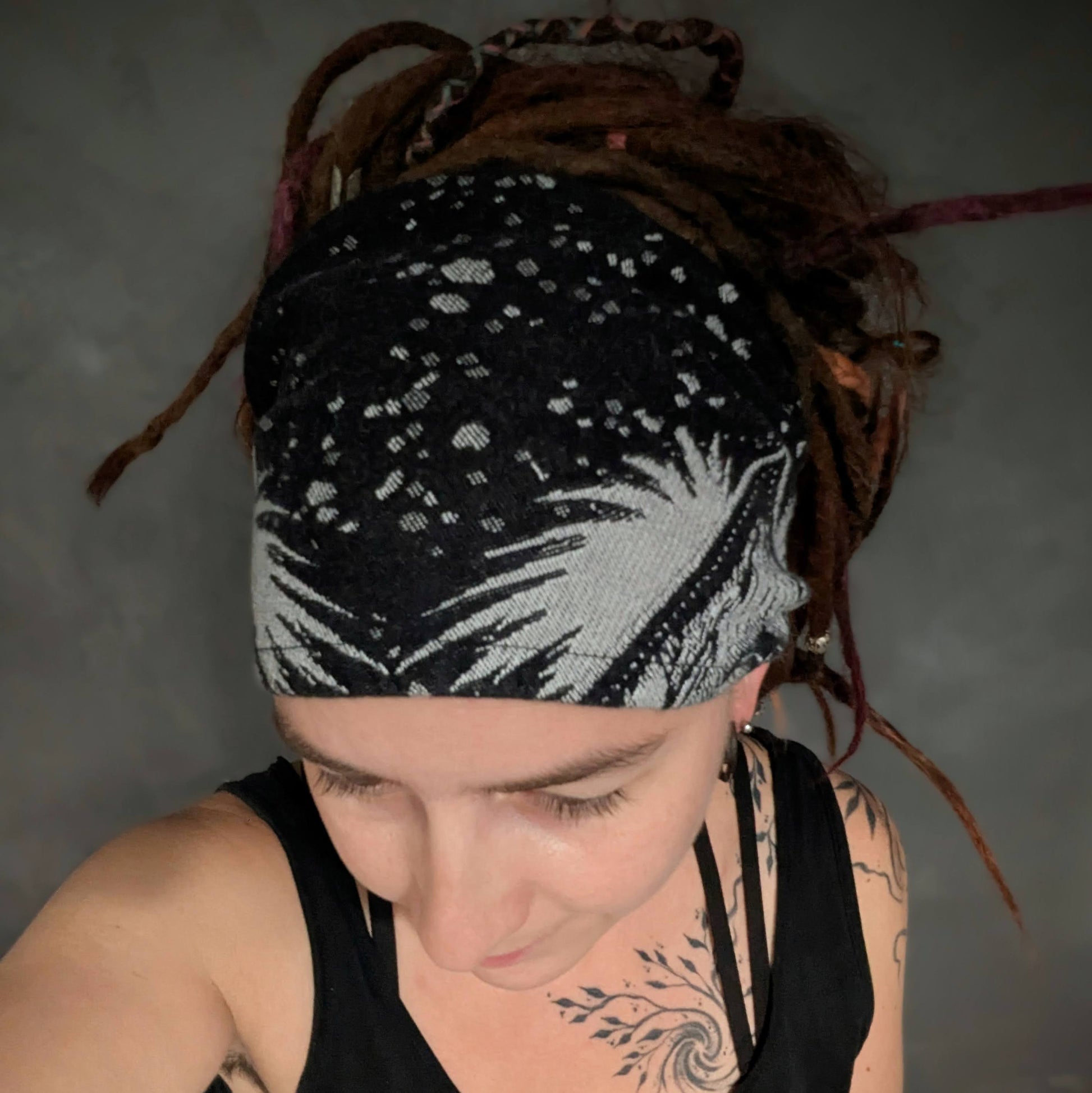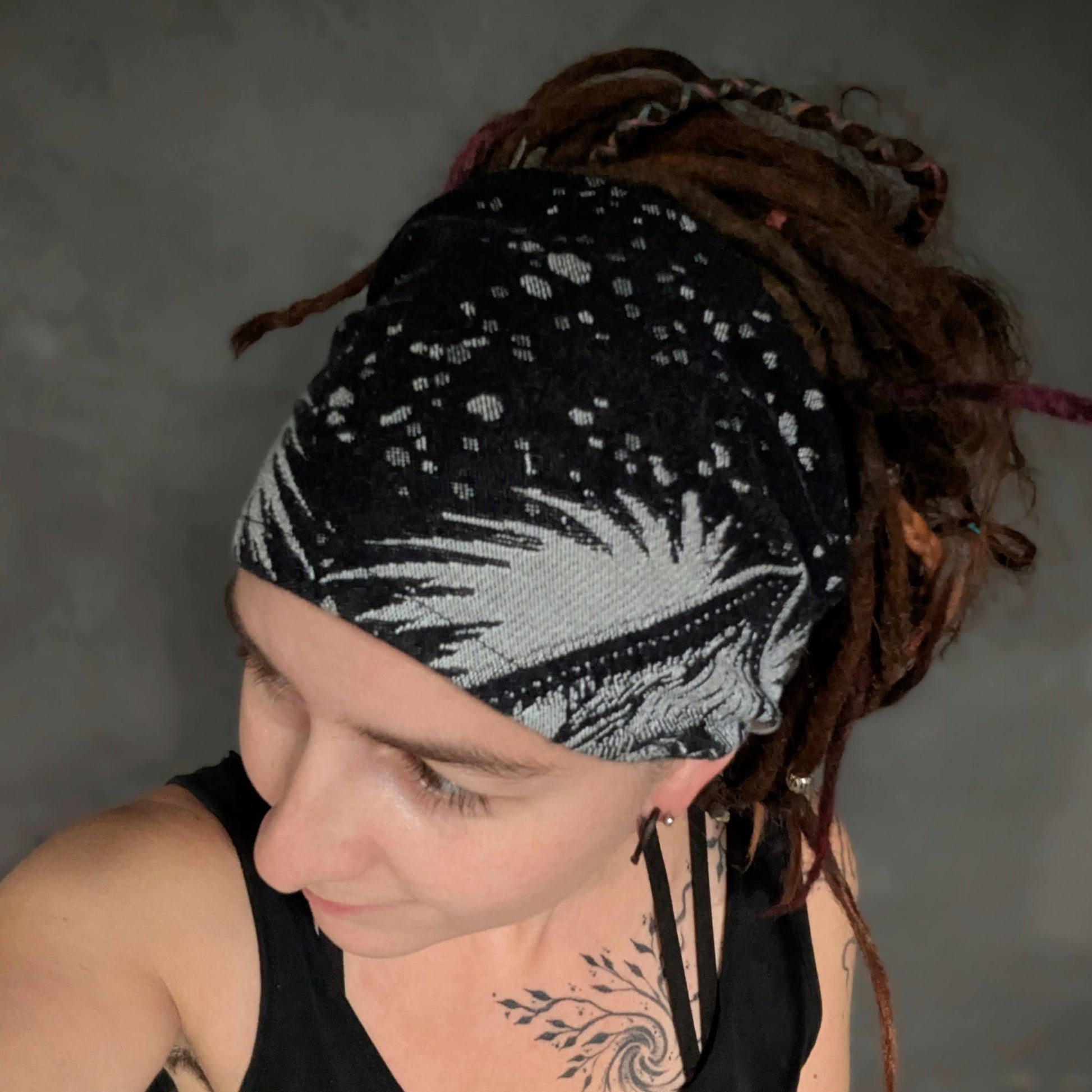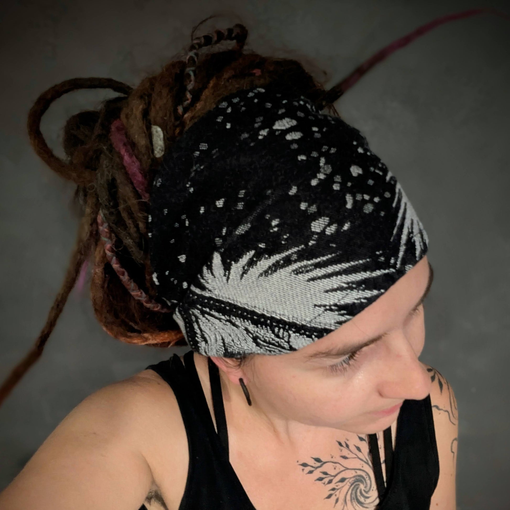 Practical scarf headband sewn from a babywearing scarf cutout (Luluna brand).