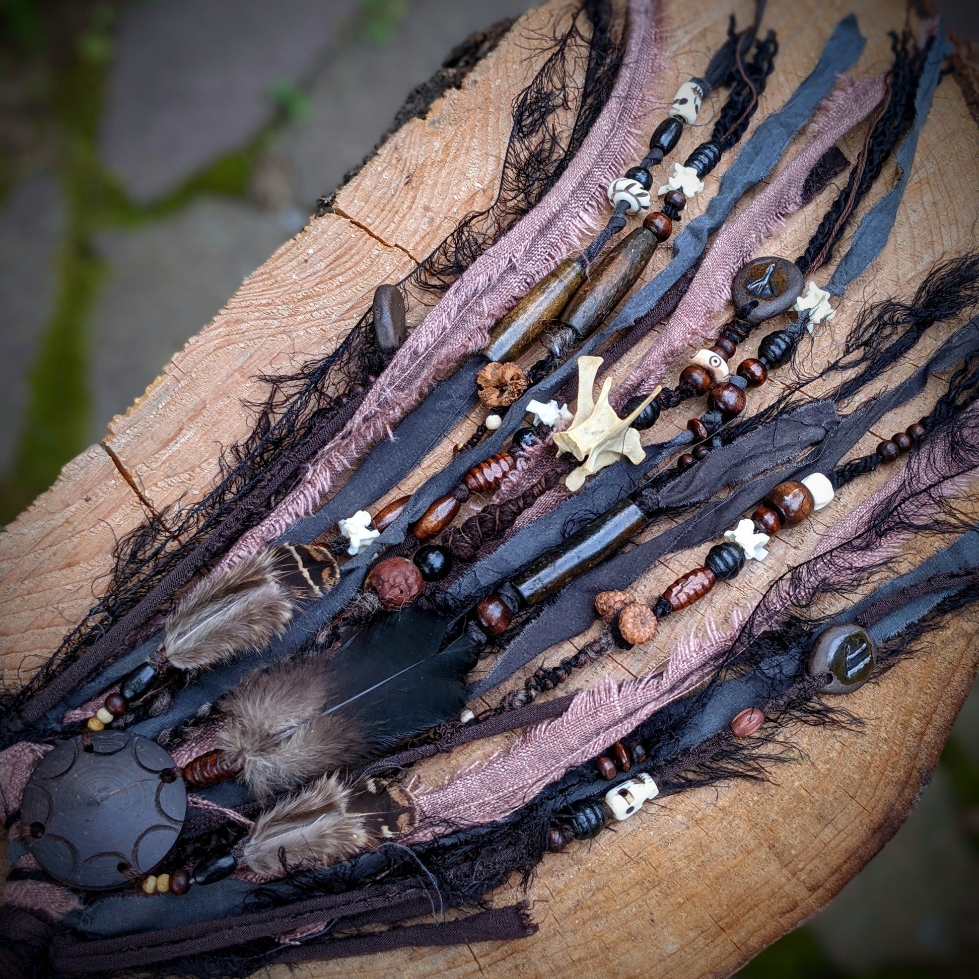A hair and dreadlock clip consisting of a wooden ring and a sandalwood needle (it smells beautiful). The clip is decorated with fabric and yarn scraps, wooden and bone beads, acorns, bones and feathers.