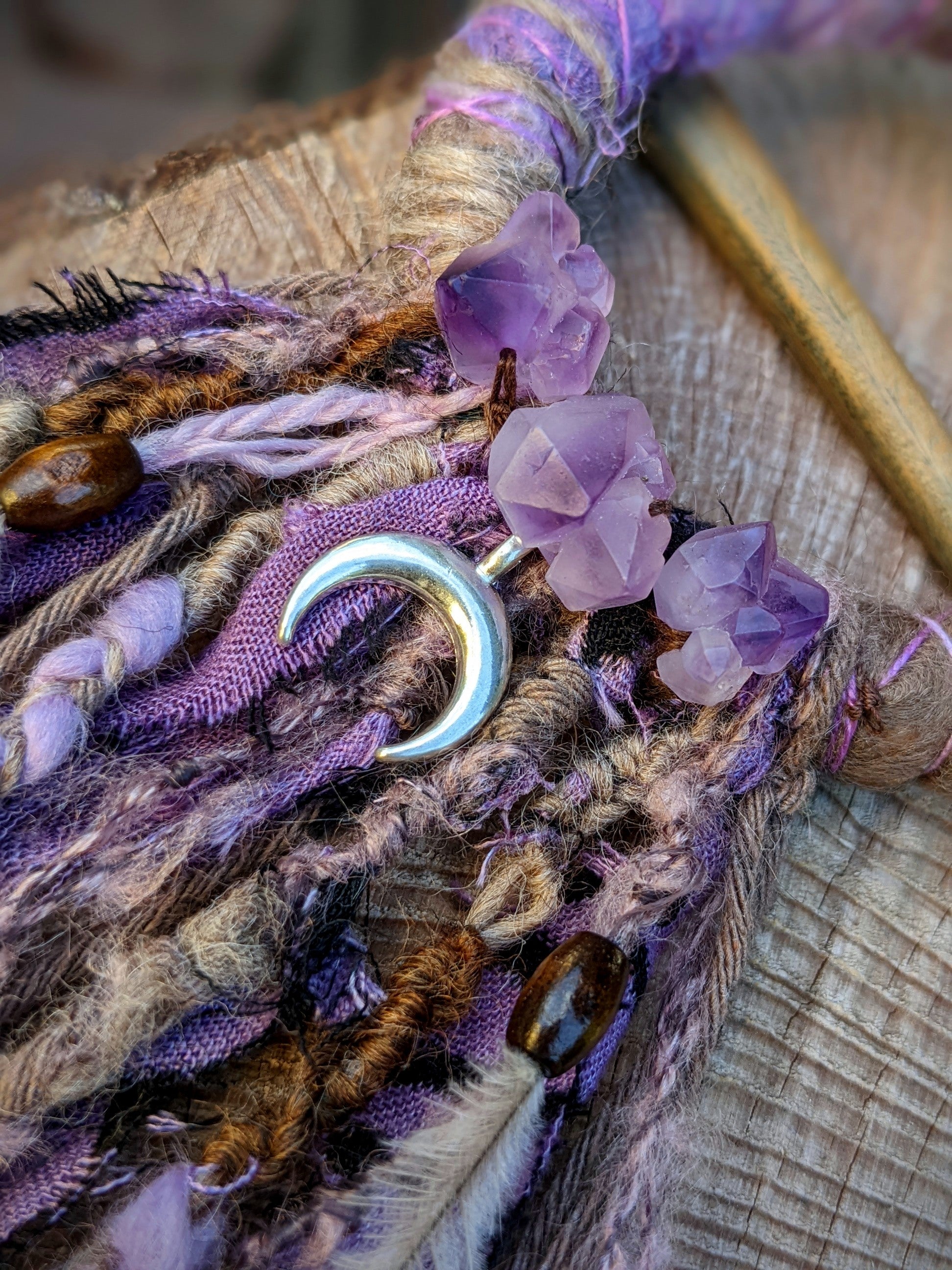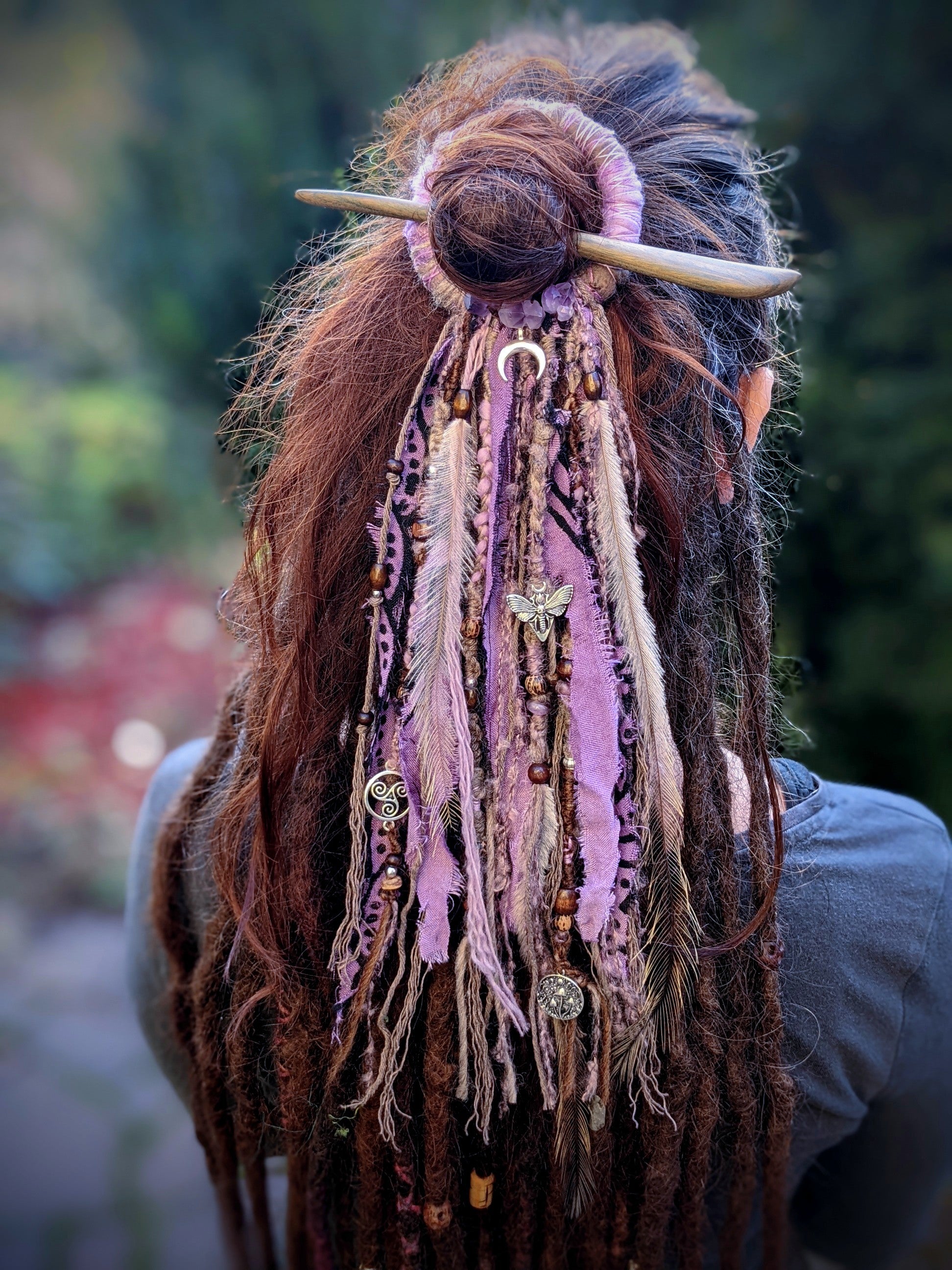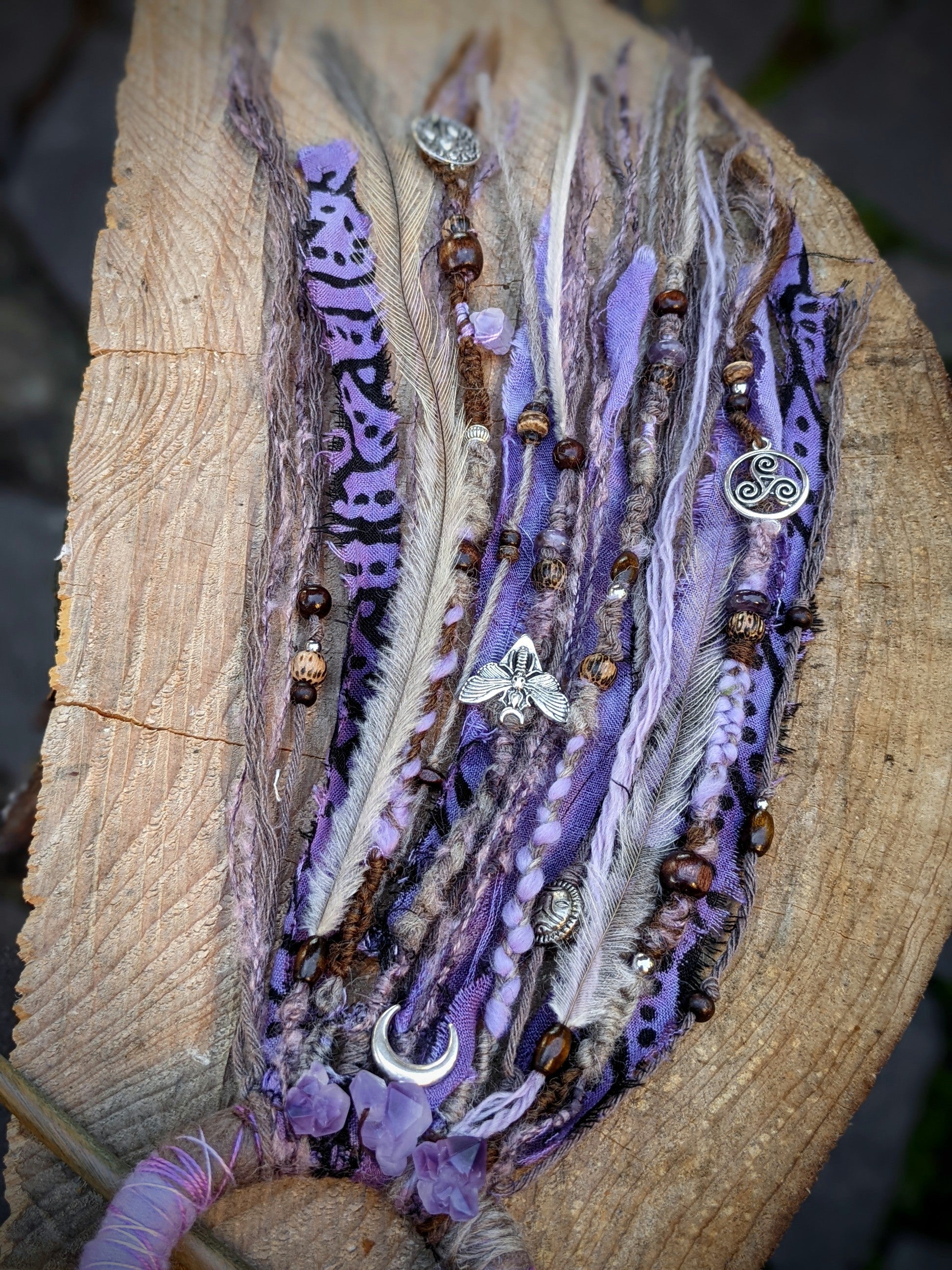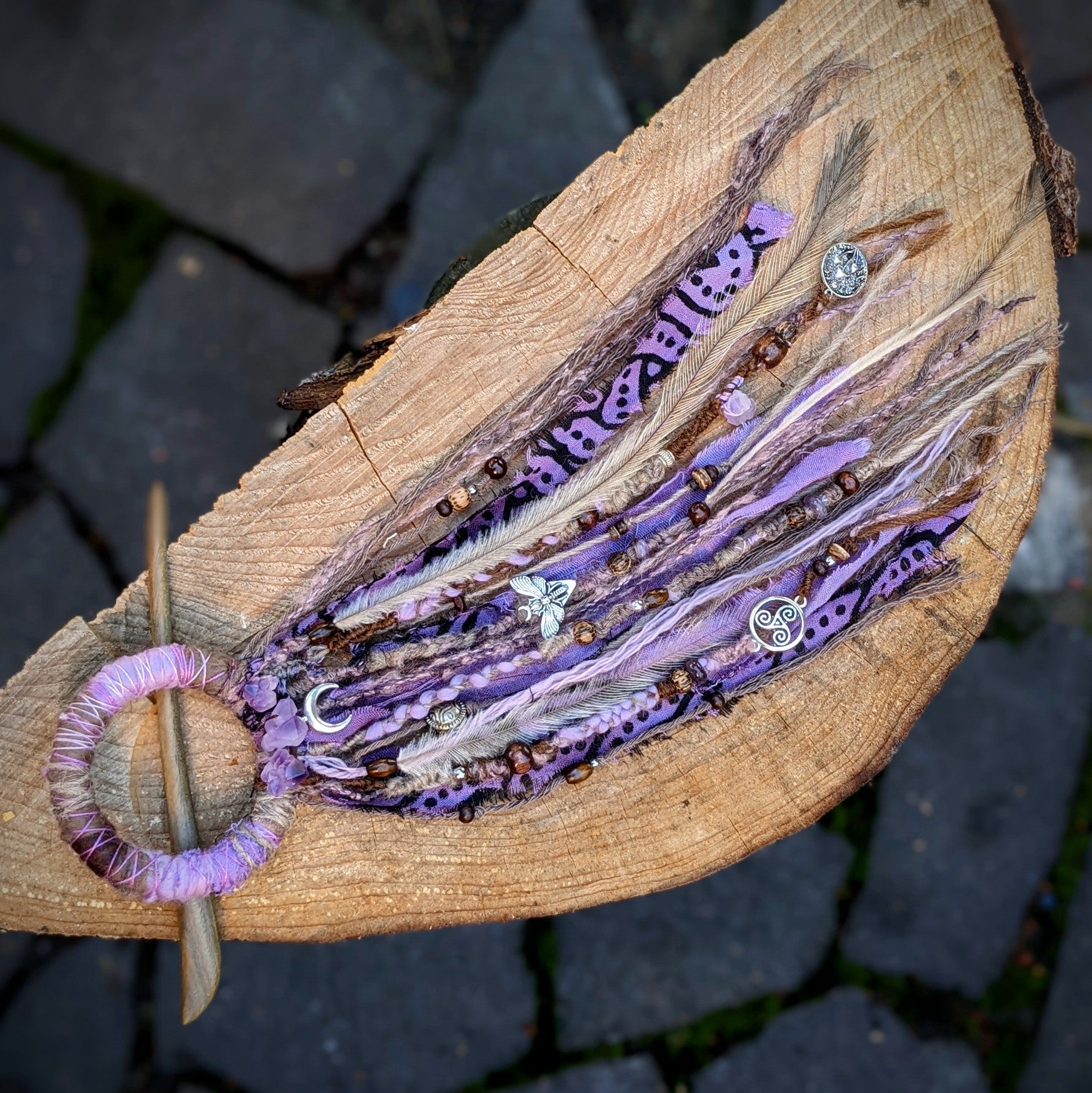 A hair and dreadlock clip consisting of a wooden ring and a sandalwood needle (it smells great). The clip is decorated with fabric and yarn scraps, wooden and metal beads, amethysts, metal pendants and emu feathers.