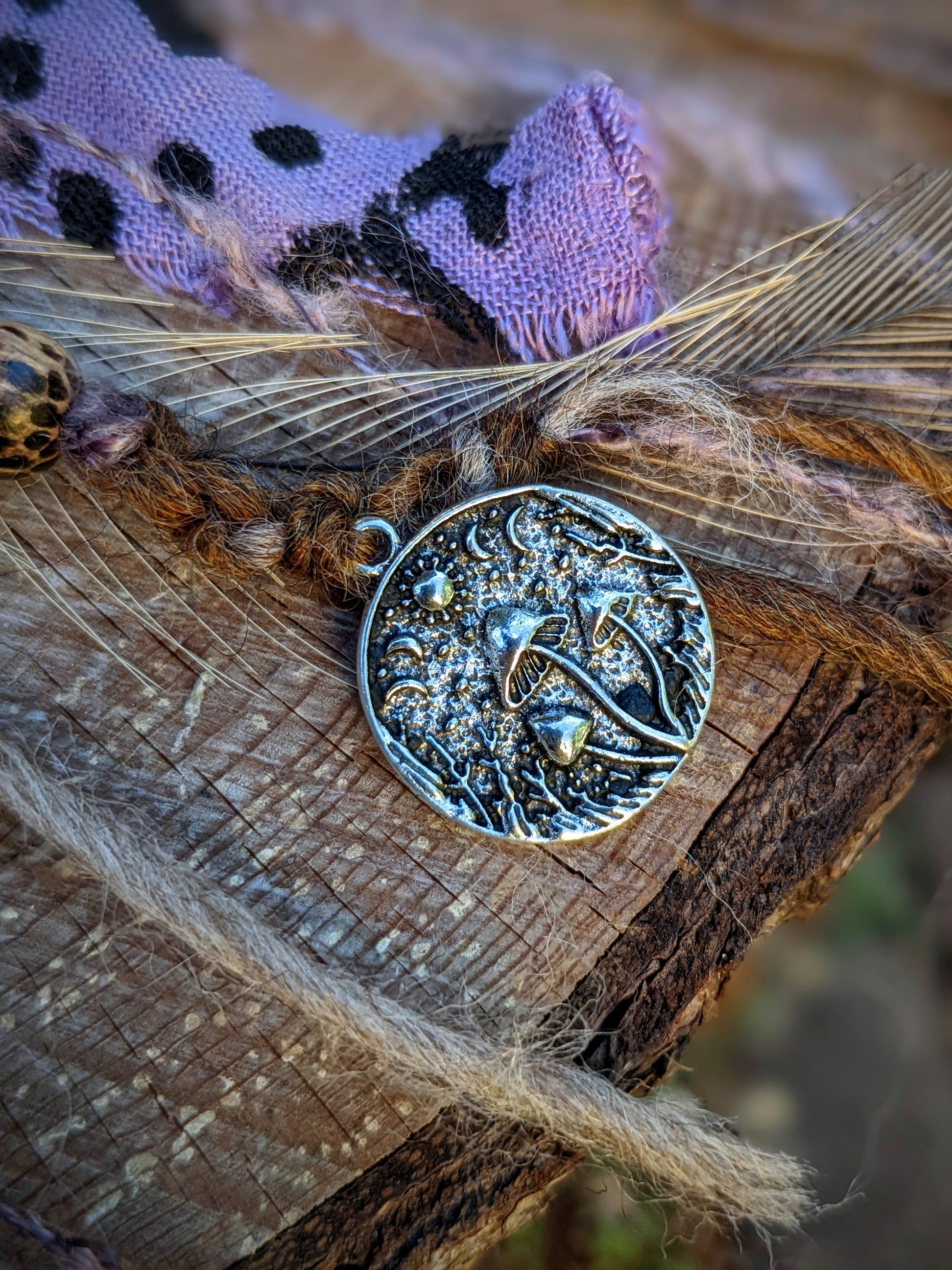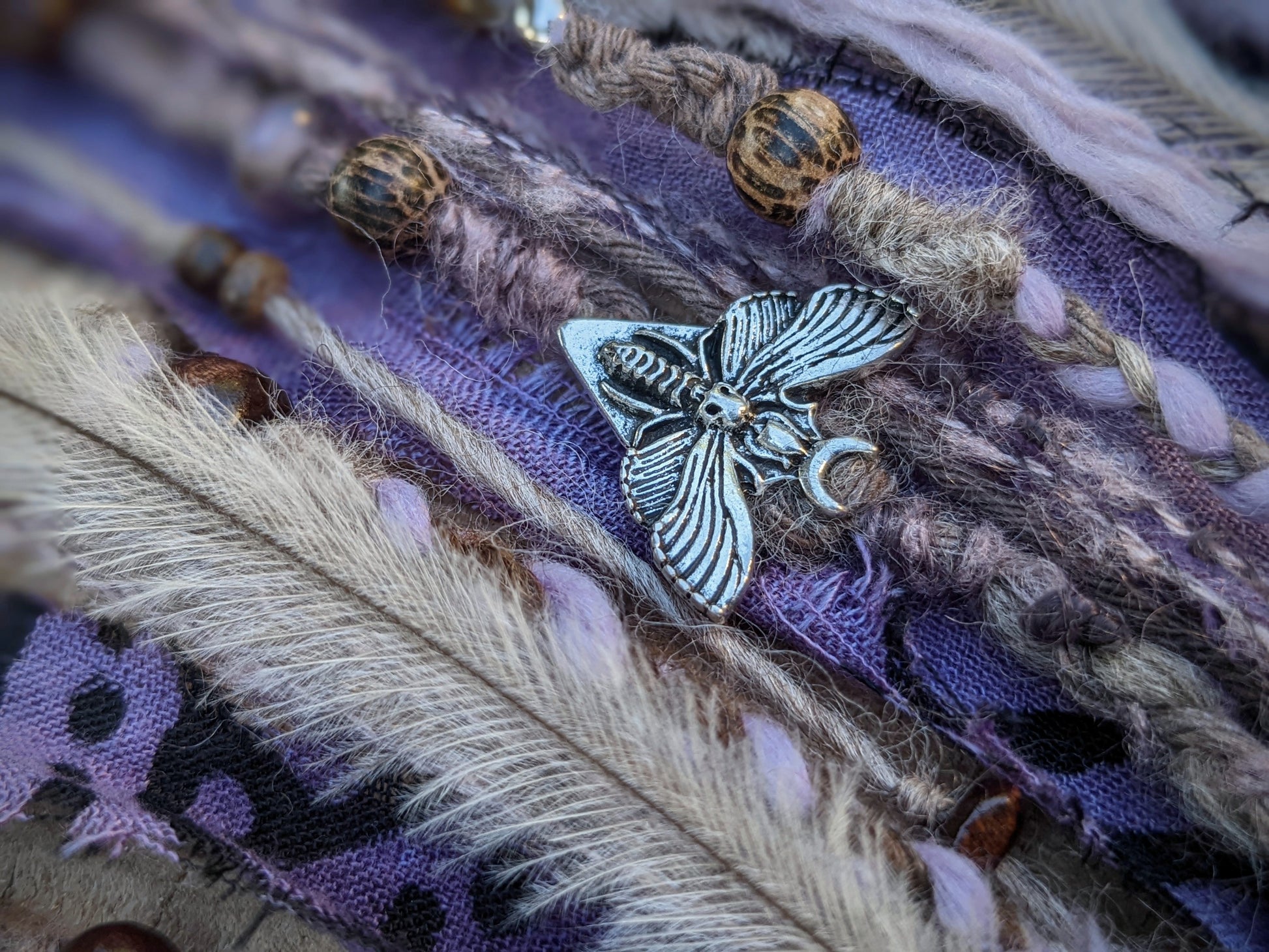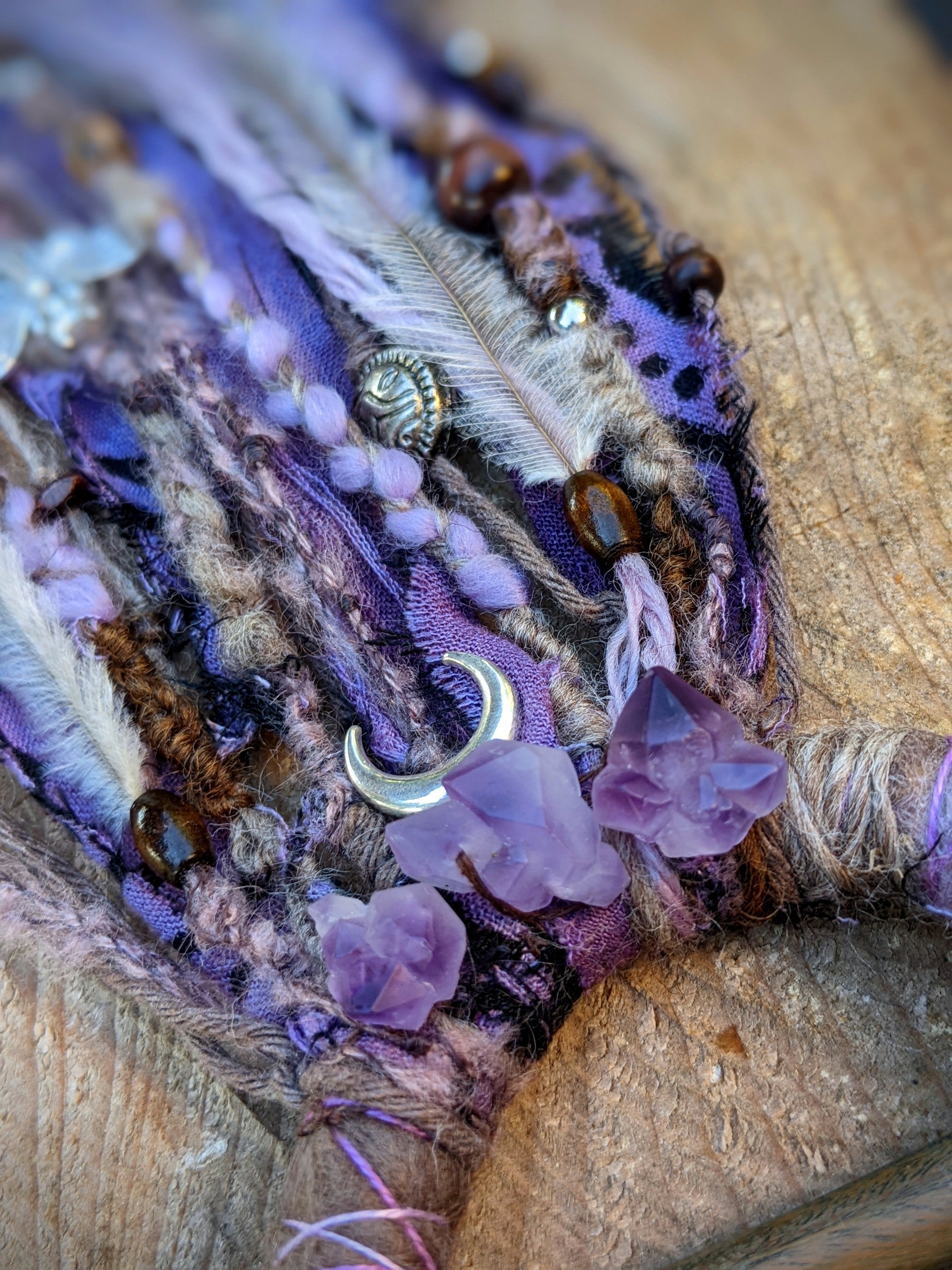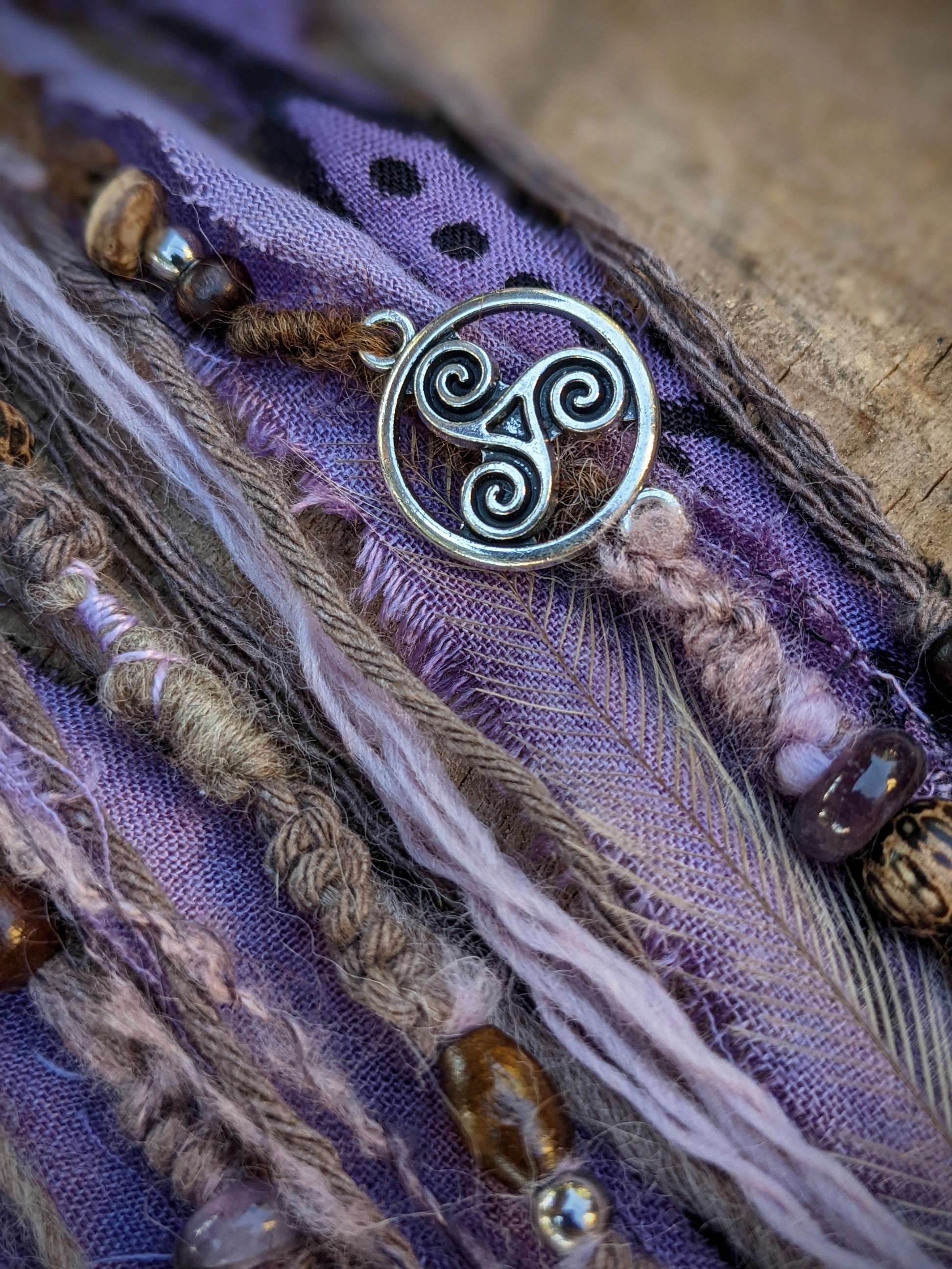 A hair and dreadlock clip consisting of a wooden ring and a sandalwood needle (it smells great). The clip is decorated with fabric and yarn scraps, wooden and metal beads, amethysts, metal pendants and emu feathers.